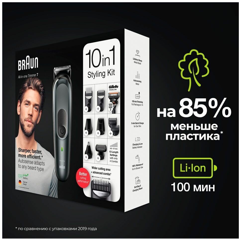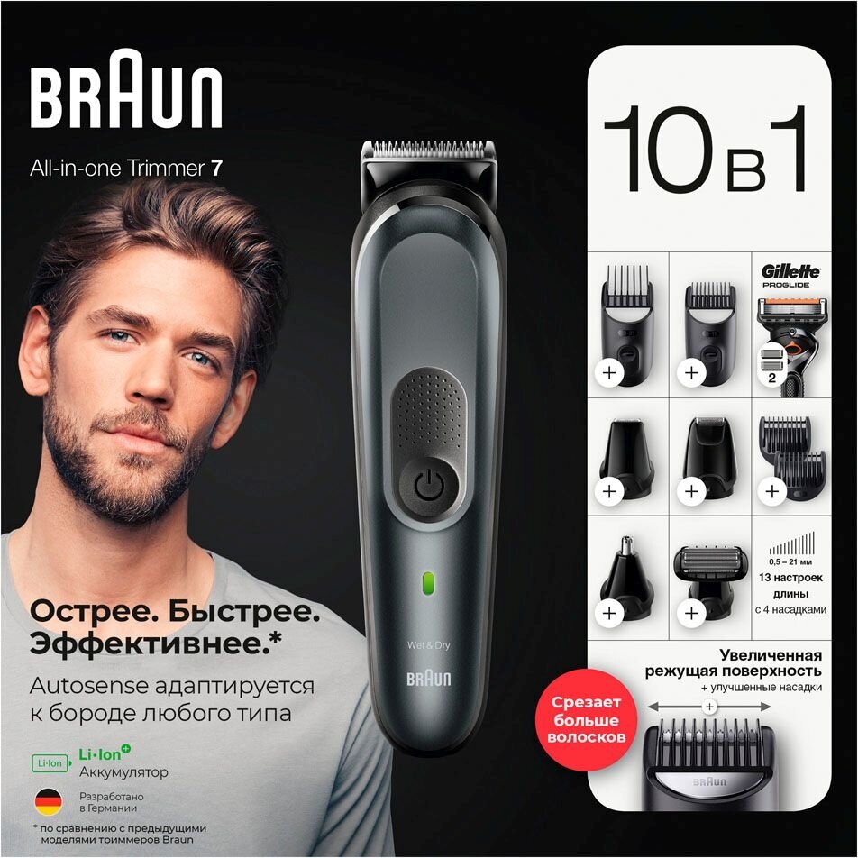 Триммер для бороды, усов и волос Braun MGK7321, 10 в 1, 8 насадок и бритва Gillette, серебристый