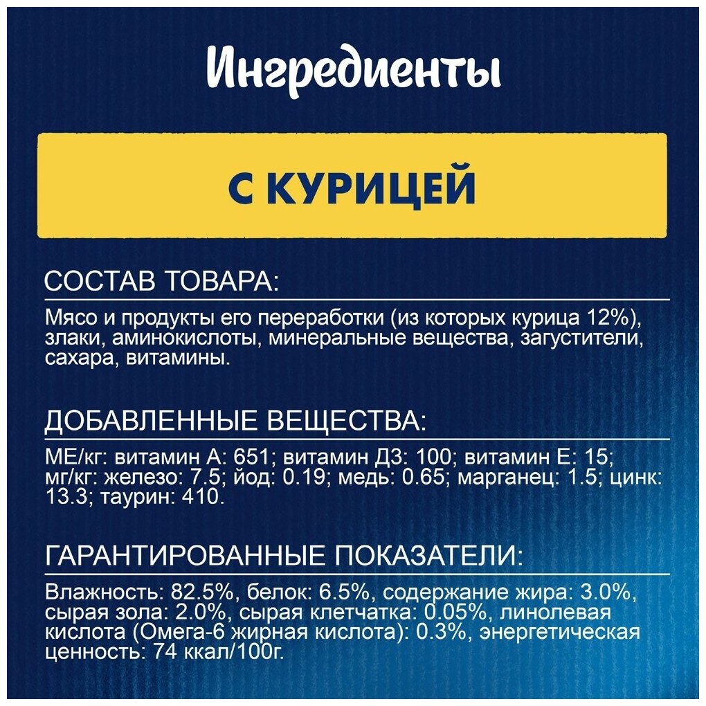 | Состав | мясо и продукты его переработки (из которых курица 12%), злаки, аминокислоты, минеральные вещества, загустители, сахара, витамины |