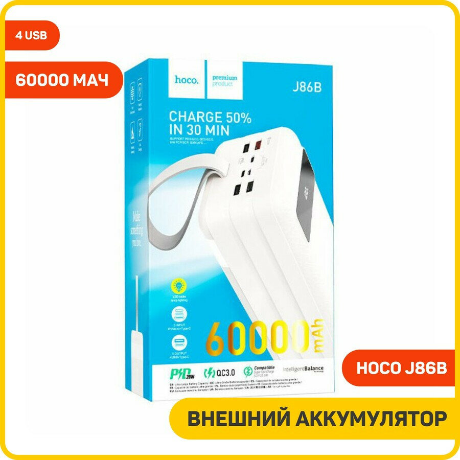 Внешний аккумулятор 60000mAh 4USB 3.0A 22.5W PD 20W+QC3.0 Li-pol батарея Hoco J86B Electric White