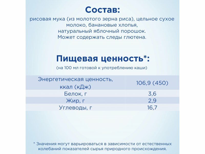 | Состав | рисовая мука (из молотого зерна риса), цельное сухое молоко, банановые хлопья, натуральный яблочный порошок. Может содержать следы глютена |
