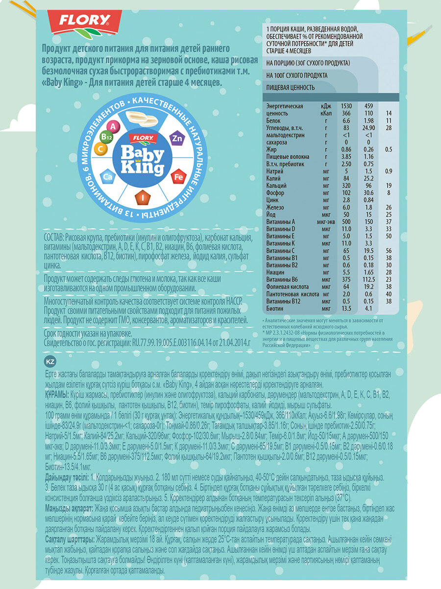 | Состав | рисовая крупа, пребиотики (инулин и олигофруктоза), карбонат кальция, витамины (мальтодекстрин, A, D, E, K, C, B1, B2, ниацин, B6, фолиевая кислота, пантотеновая кислота, B12, биотин), пирофосфат железа, йодид калия, сульфат цинка |