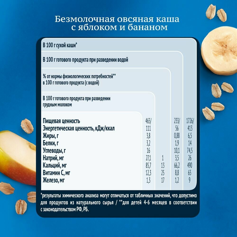 | Состав | мука овсяная (94,7%) (содержит глютен), хлопья яблока (2%), банан (2%), минеральные вещества (кальция карбонат, железа (II) фумарат), бифидобактерии |