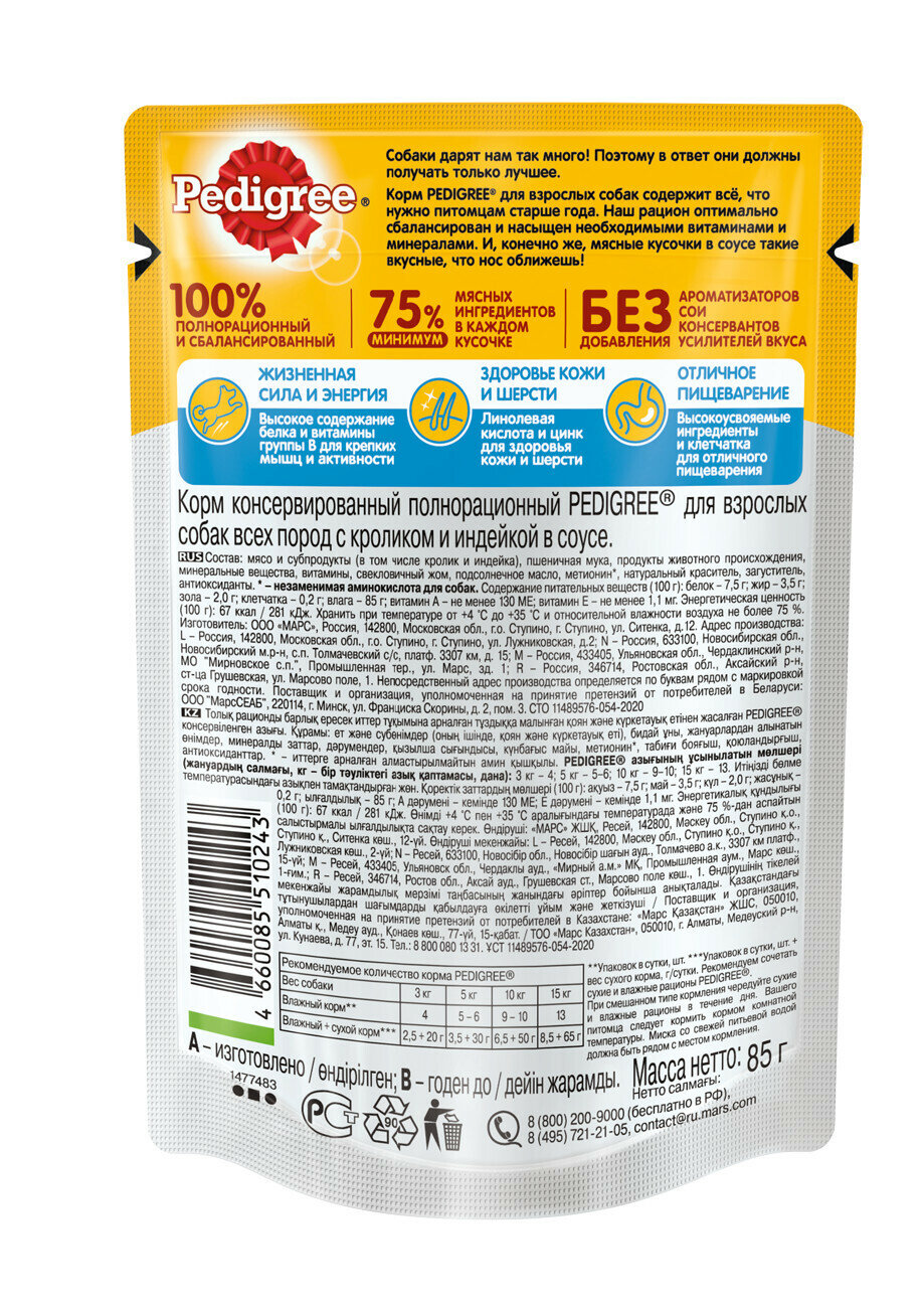 Pedigree Паучи для взрослых собак всех пород с кроликом и индейкой в соусе 85г 10222563 0,085 кг 43496 (26 шт)