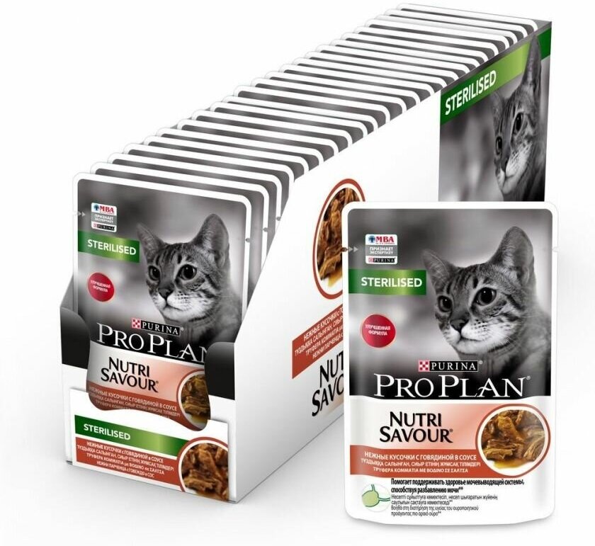 Pro Plan Nutrisavour Sterilised пауч для стерилизованных кошек и котов (кусочки в соусе) Говядина, 85 г. упаковка 26 шт