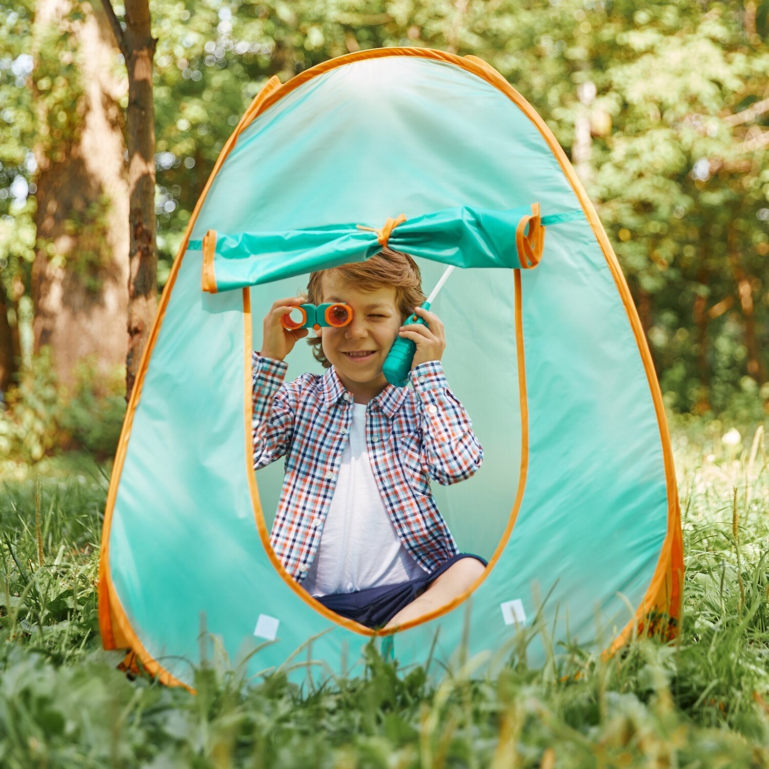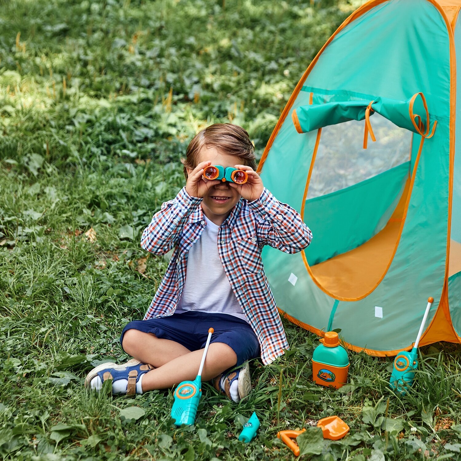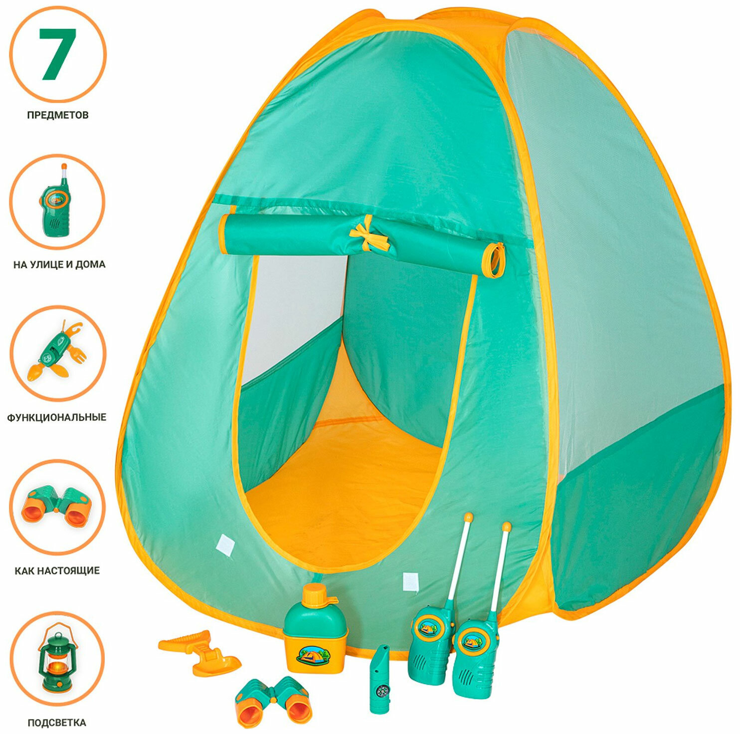 Детская игровая палатка "Набор Туриста" с набором для пикника 6 предметов: фляга, лопатка, бинокль, рации 2 шт., мультиприбор (свисток, фонарик, компа