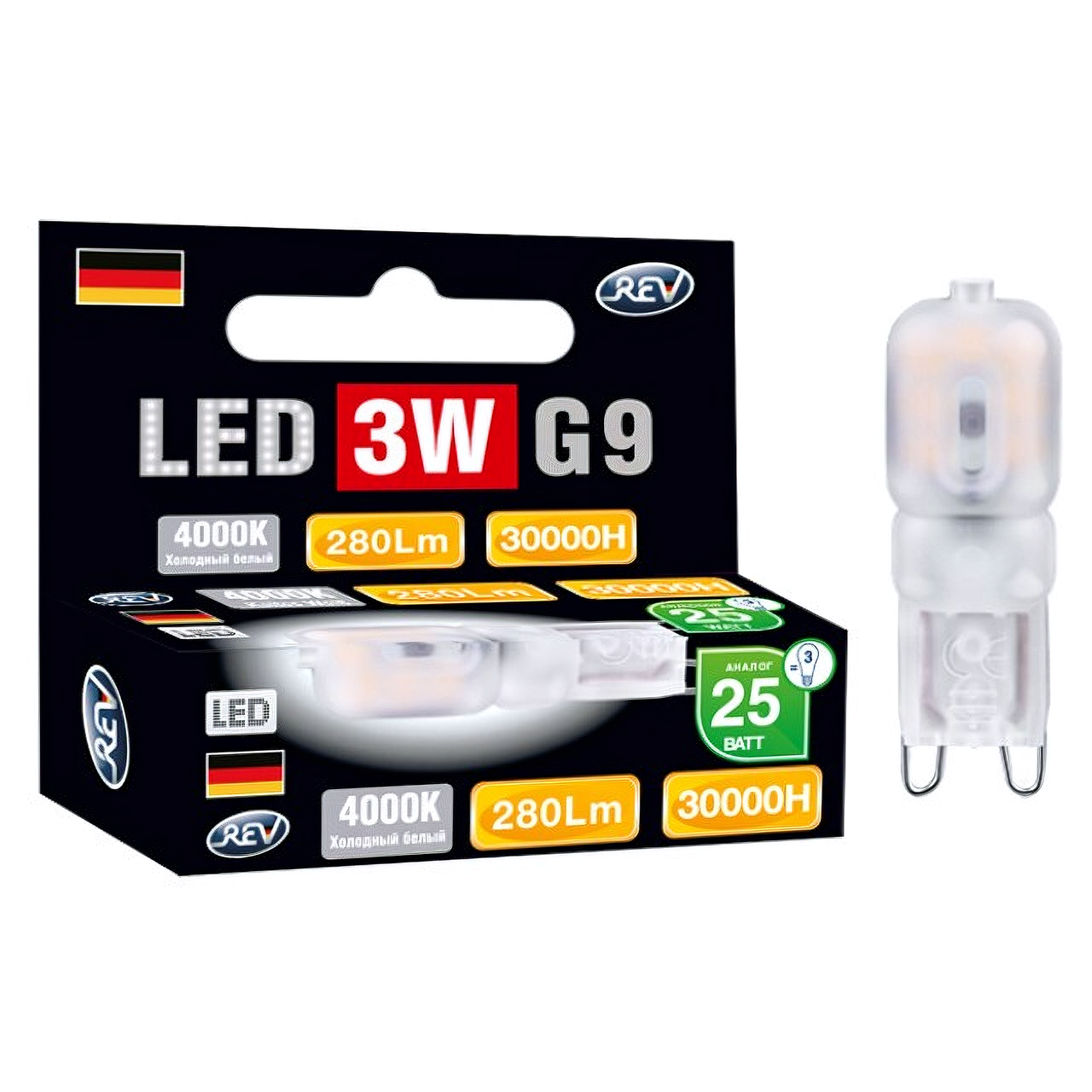 Лампочка светодиодная REV, JCD G9 3W 4000K, дневной свет