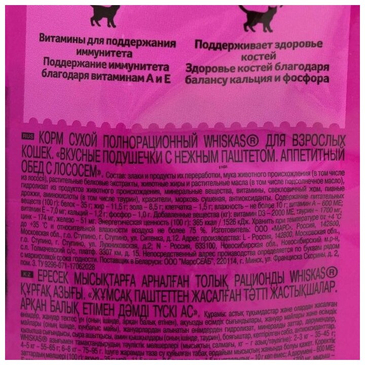 Сухой корм Whiskas для кошек, лосось, подушечки, 350 г
