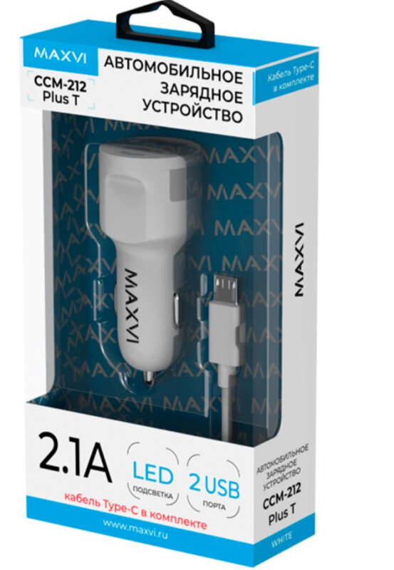 Автомобильное зарядное устройство MAXVI CCM-212 Plus T 2.1A, 2xUSB, кабель Type-C, белый