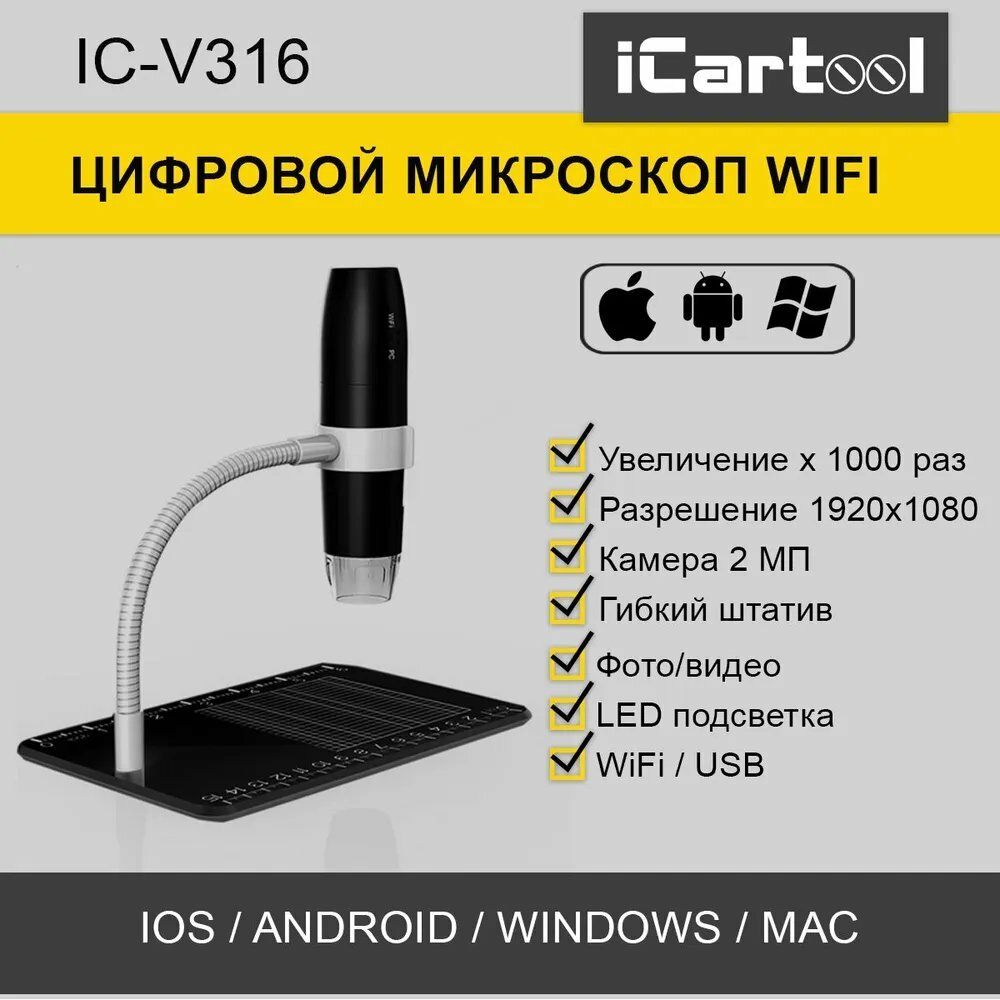 Купить IC-V316 iCartool Микроскоп Wifi, 2Мп, 1000X, 1920x1080,2MП IC-V316 .