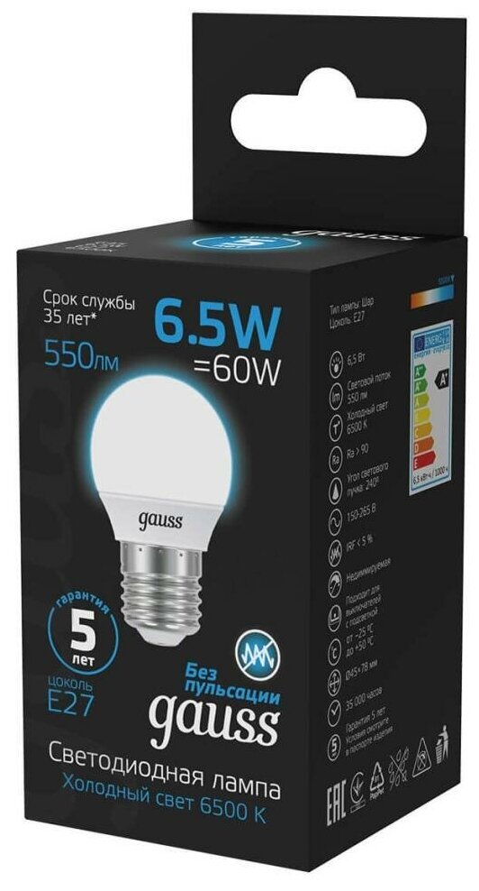 Светодиодная лампа Gauss Шар 6.5W 550lm 6500K E27 LED 1/10/100