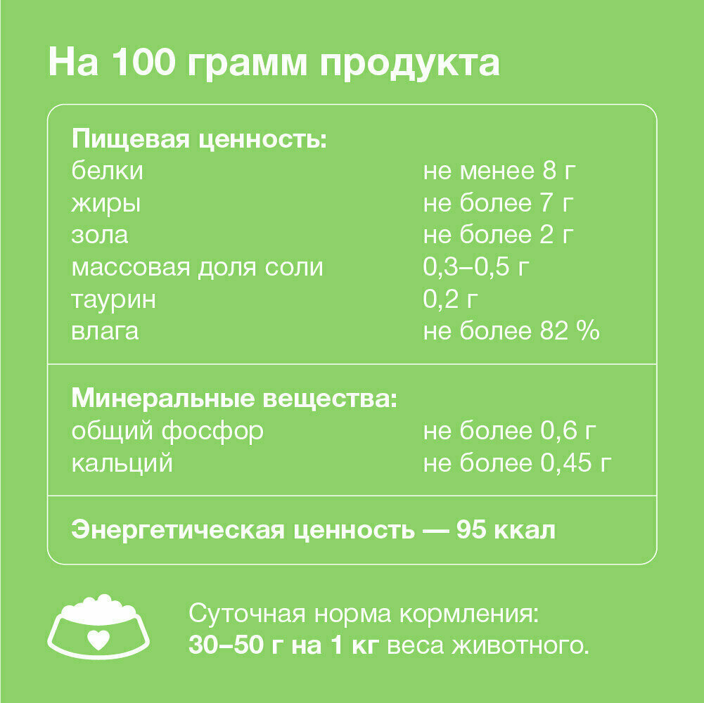 | Пищевая ценность | белки - не менее- 8,0 %, жиры - не более 7,0 %, зола - не более 2,0 %, массовая доля соли - 0,3-0,5 %, таурин - 0,2 %, влага - не более 82,0% |