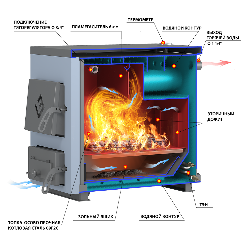 | Комплектация | Котел твердотопливный / зольный ящик / кочерга / совок / чугунный колосник / щетка |