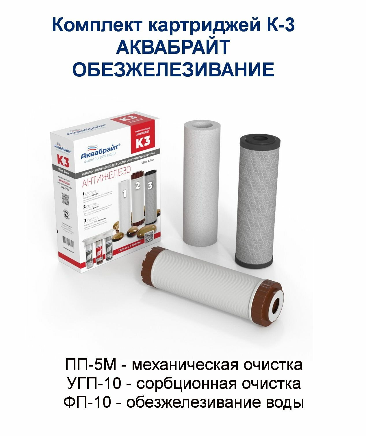 Комплект картриджей Аквабрайт К-3 Обезжелезивание для очистки воды, удаления железа (ПП-5М, ФП-10, УГП-10)