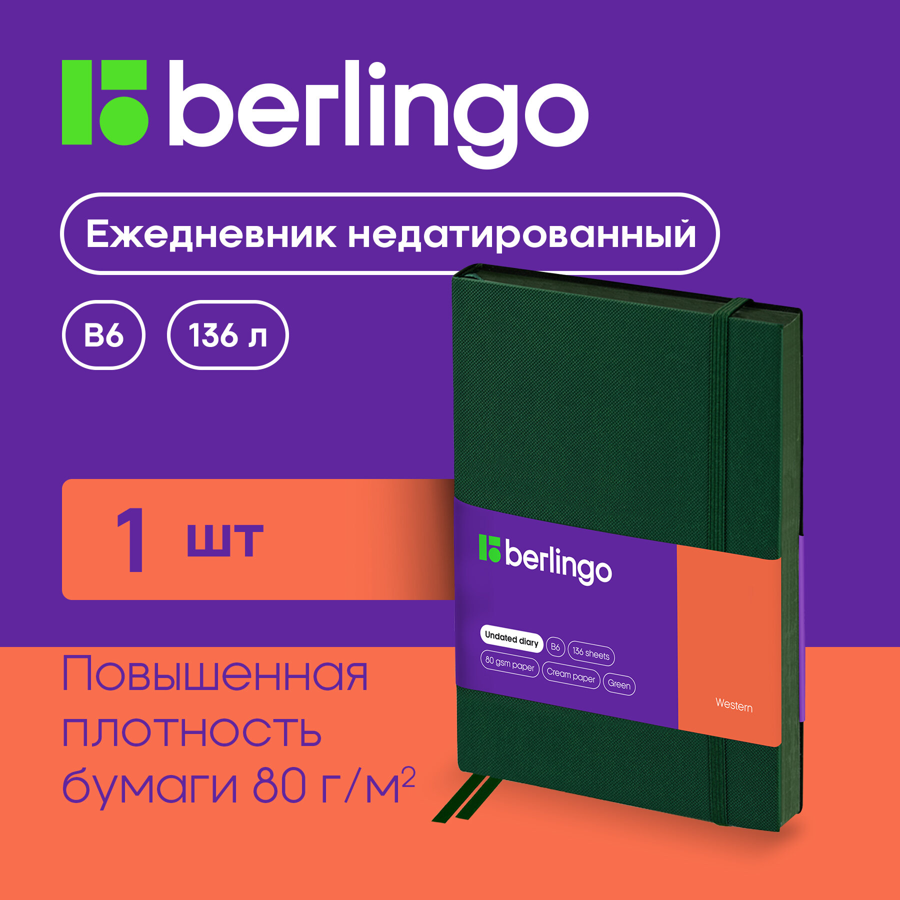 Ежедневник недатированный Berlingo B6, 136 листов, кожзам, "Western", с резинкой, зеленый (UD0_85604)