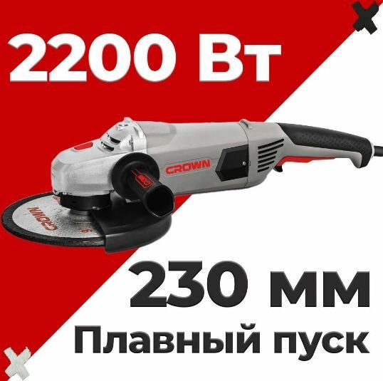 Болгарка электрическая 230мм Болгарка CROWN CT13500-230S, УШМ 2200Вт, Плавный пуск, 6500 об/мин