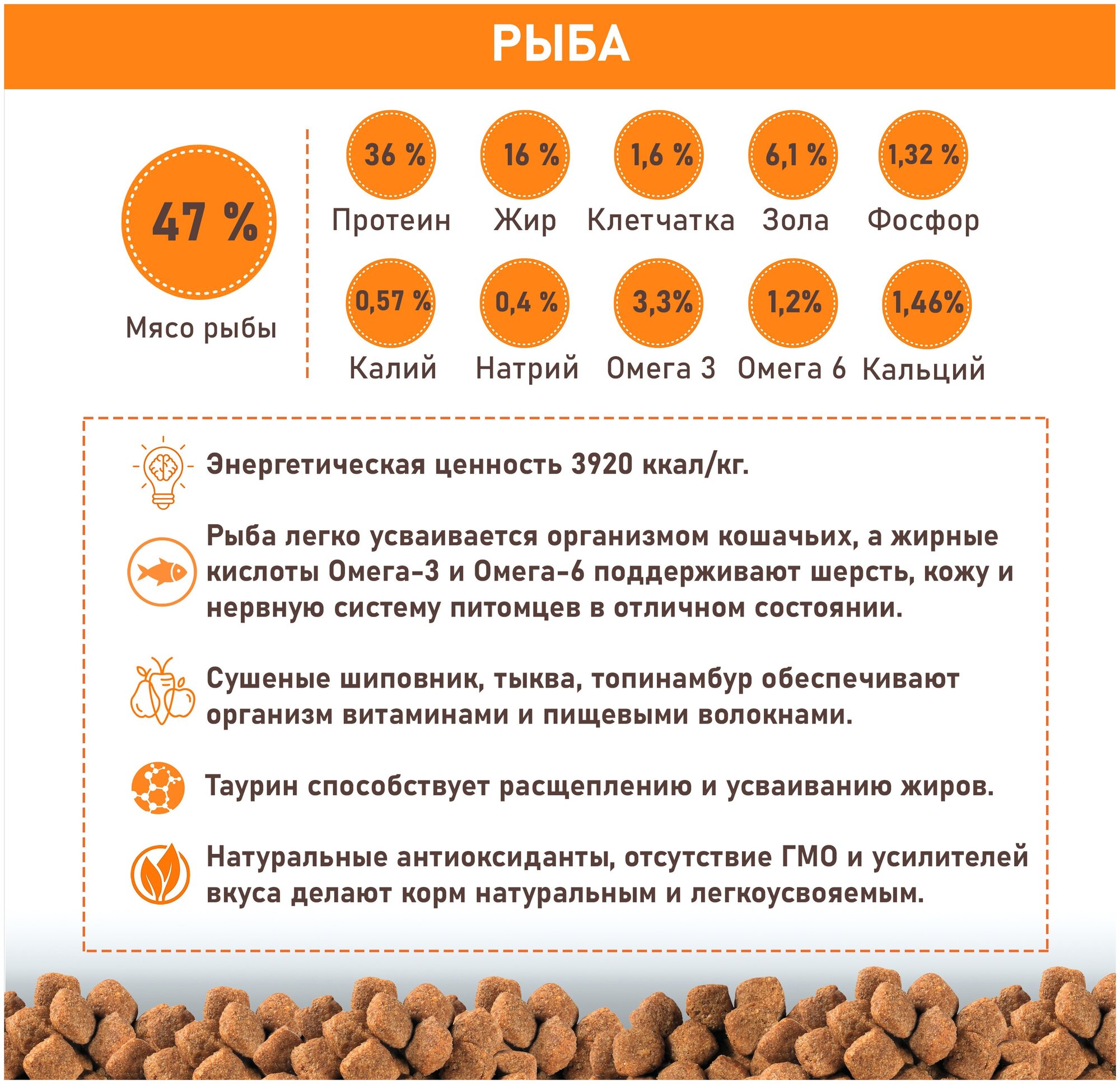 | Пищевая ценность | Рыба: 47 % Протеин 36 %, Жир 16 % Клетчатка- 1,6 %, Зола- 6,1%, Кальций-1,46 %, Фосфор-1,32 %, Калий – 0,57 % Натрий – 0,4 % Омега 3 – 3,3 %, Омега 6- 1,2 %, Влажность- 7 % |