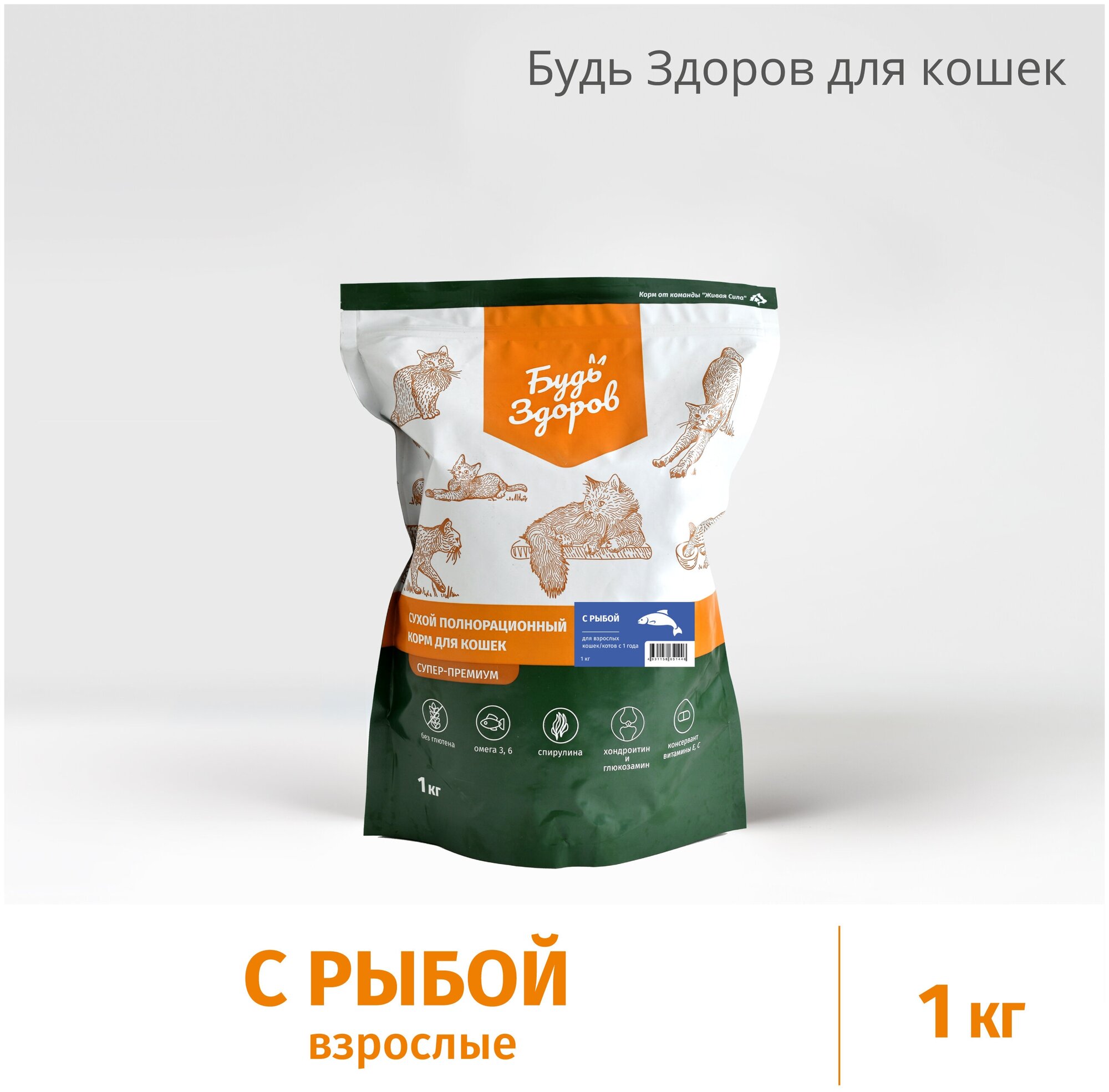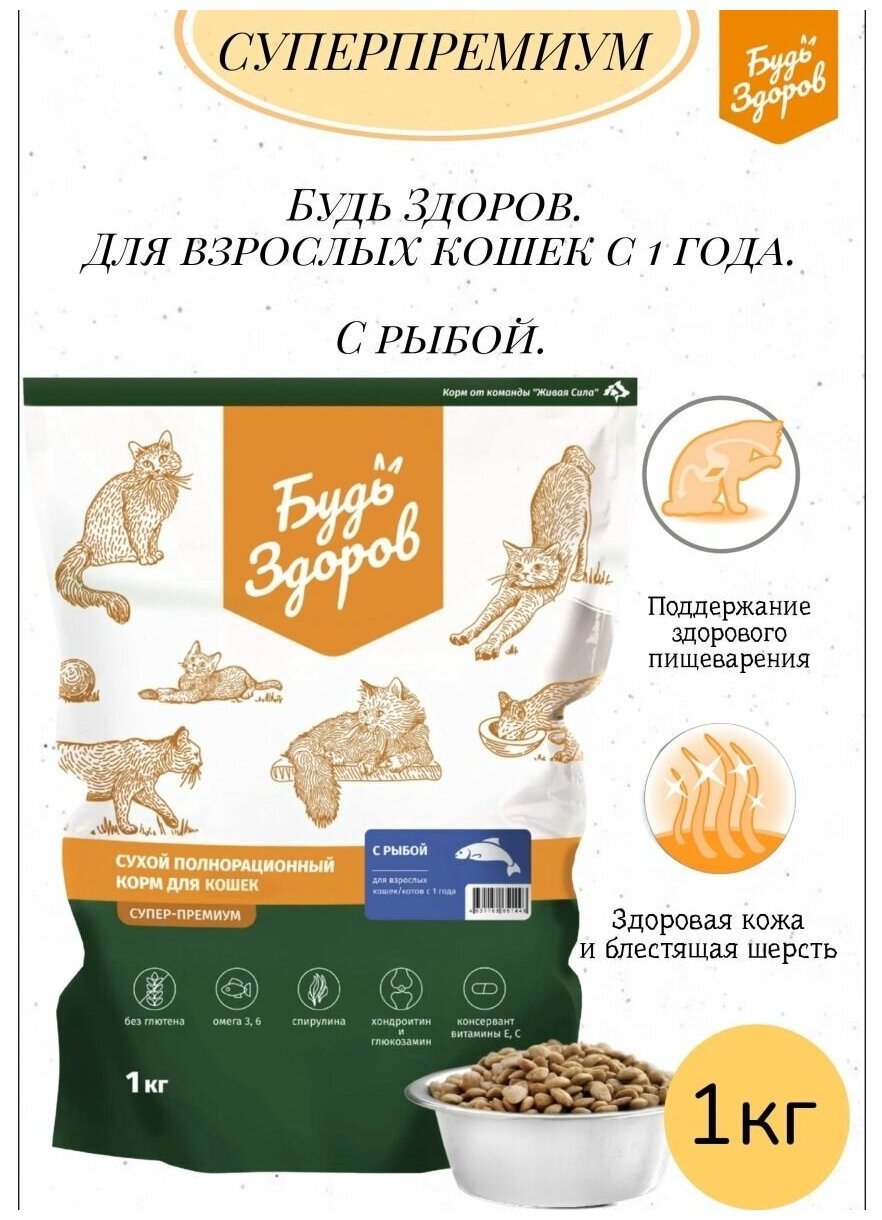 Будь здоров. Живая сила Сухой полнорационный корм для взрослых кошек с 1 года, с рыбой (1 кг)