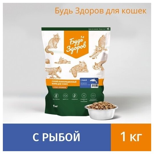 Будь Здоров сухой полнорационный корм для взрослых кошек с 1 года, с рыбой (1 кг)