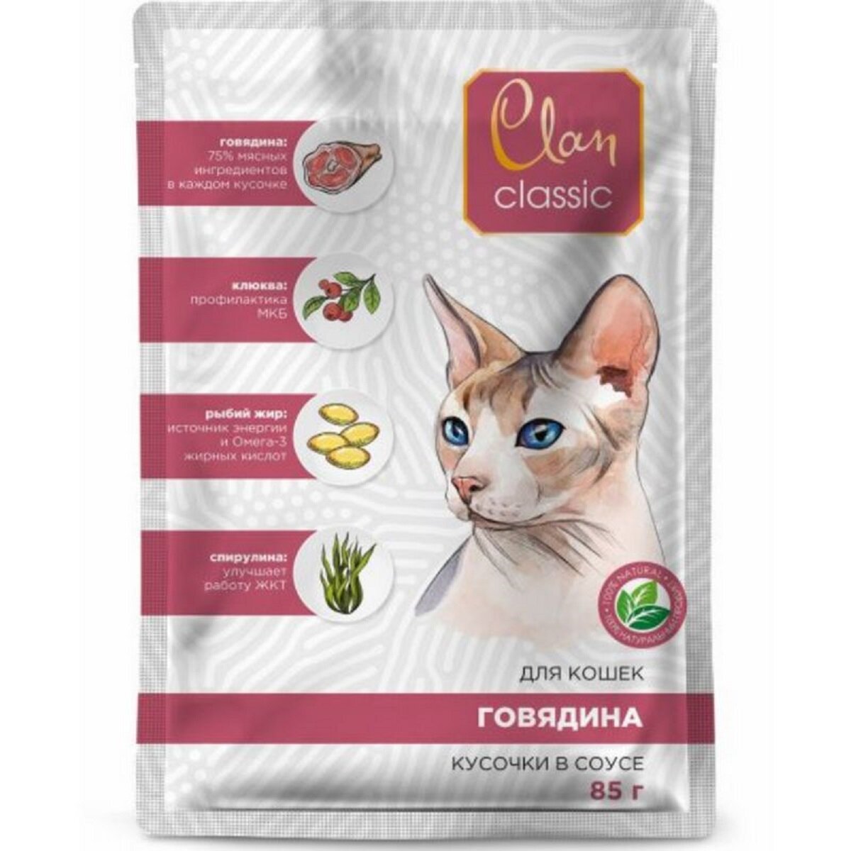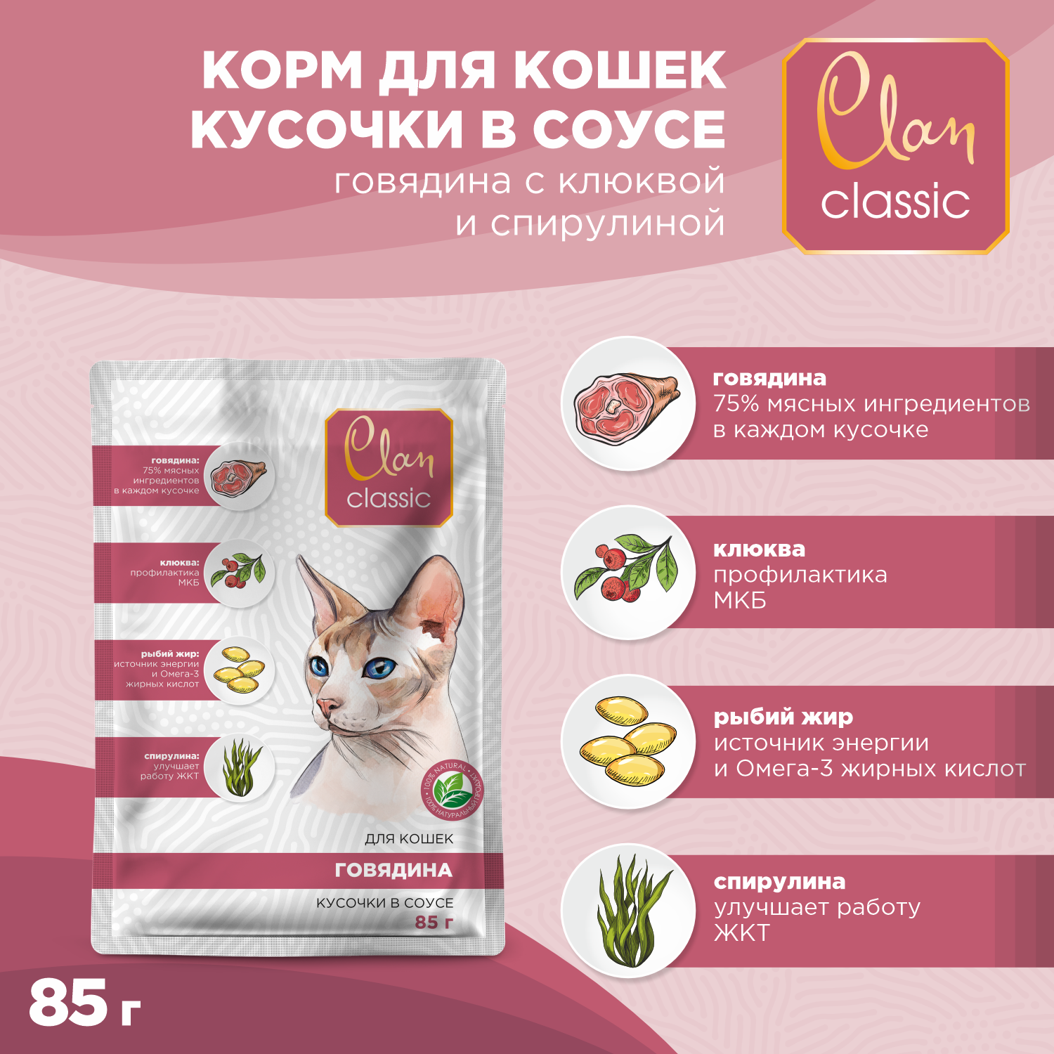 Clan CLASSIC пауч кусочки в соусе Говядина с клюквой и спирулиной для кошек 85гр (14 паучей)