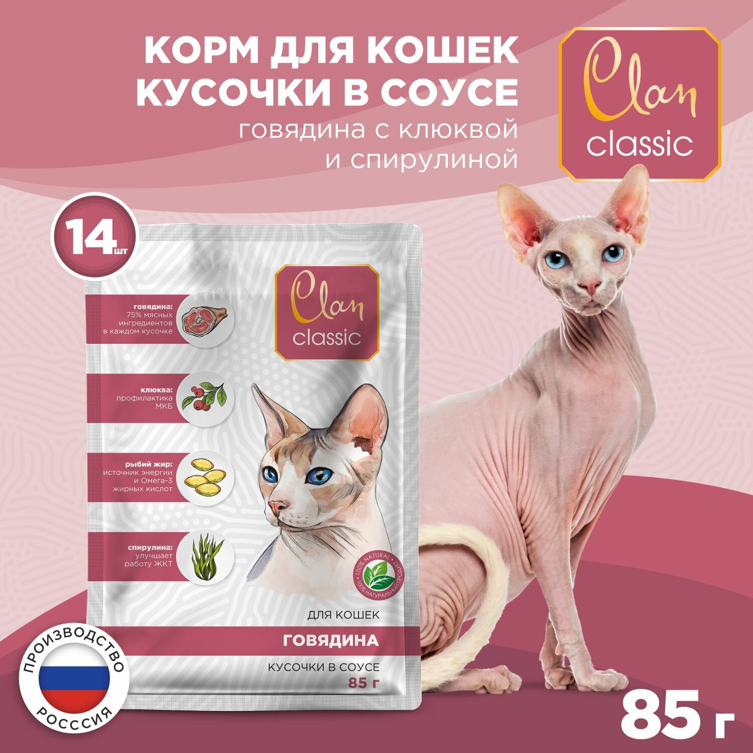 Купить Корм Clan Classic (консерв.) для кошек, говядина с клюквой и спирулиной, 85 г x 14 шт