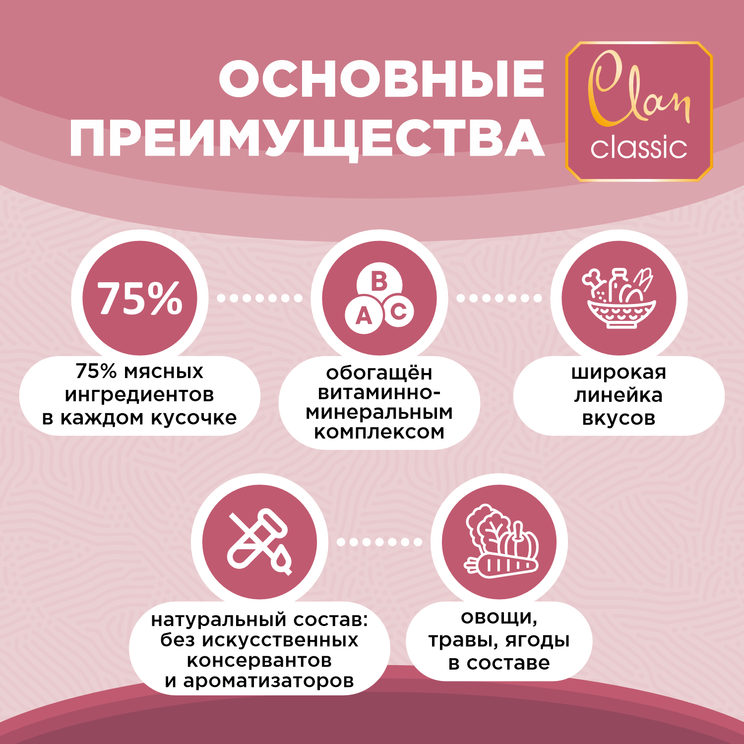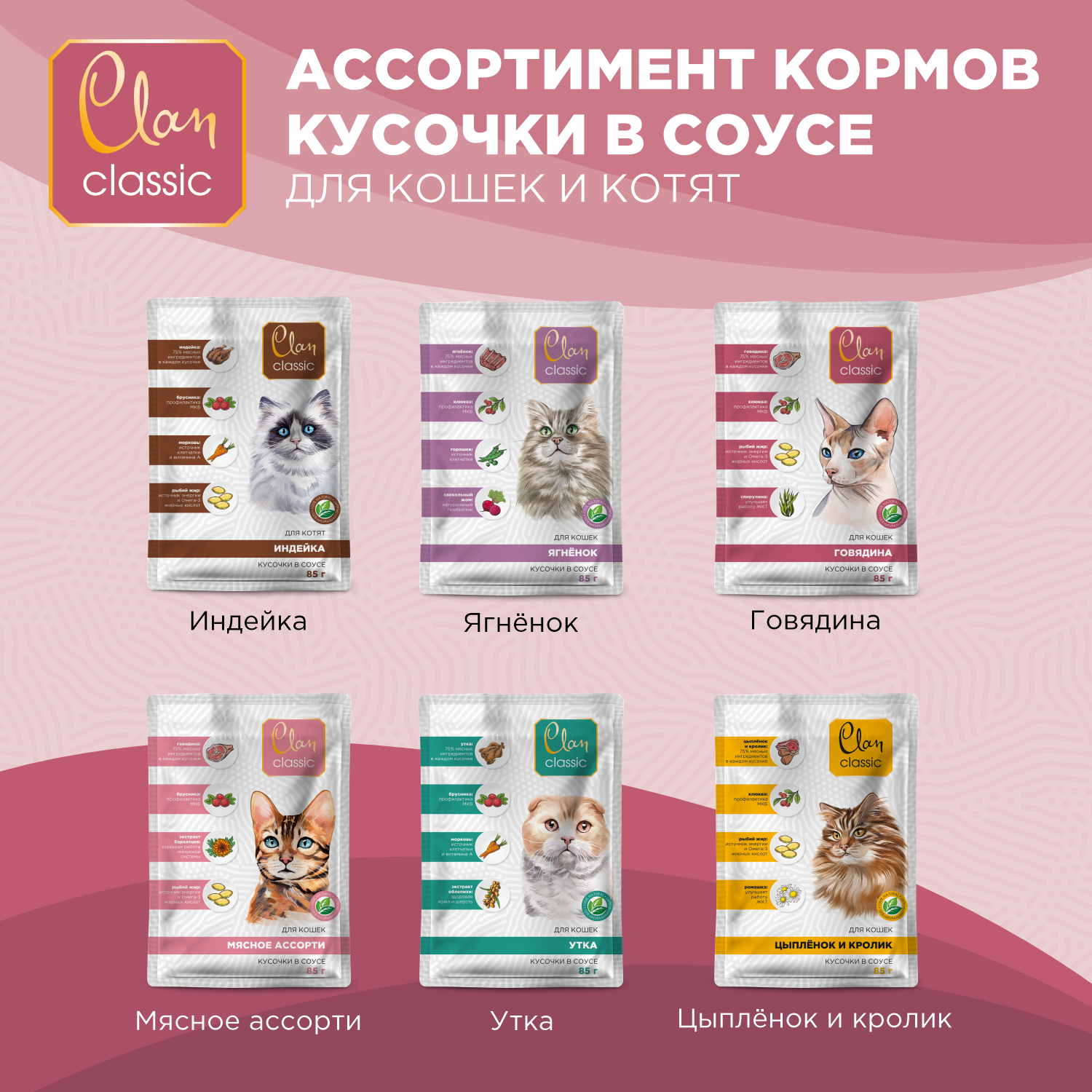 Влажный корм Clan CLASSIC для кошек, мясное ассорти, ягненок, клюква, горох, кусочки в соусе, 14шт*85г