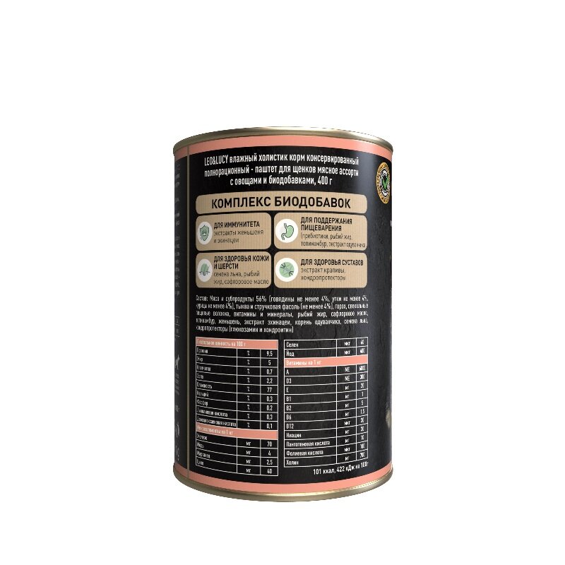 LEO&LUCY Влажный холистик корм для щенков всех пород, паштет мясное ассорти с овощами и биодобавками, 400г 0.4 кг