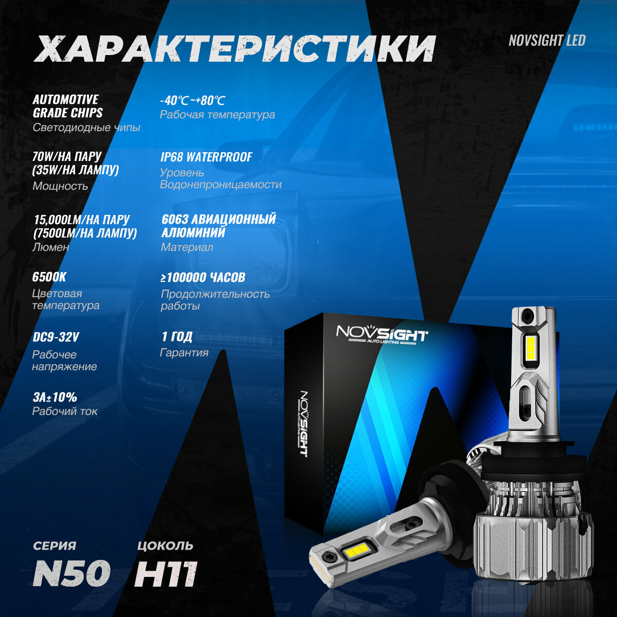 Светодиодная лампа Novsight N50 H11 цоколь PGJ19-2 70Вт 2шт 15000Лм 6500К белый свет LED автомобильная интересное:
