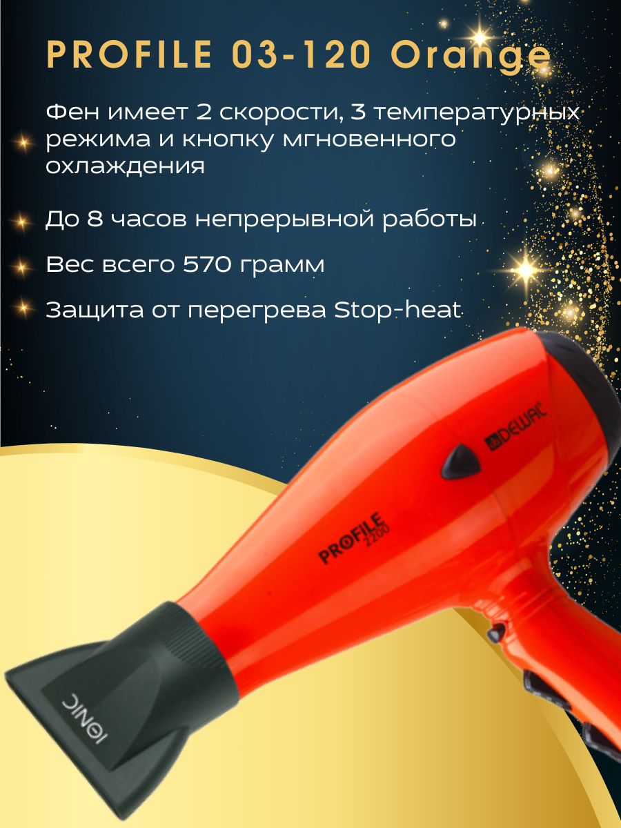 Фен DEWAL PROFILE 2200, оранжевый, вес 570гр, 2200Вт, ионизация, 2 насадки, провод 3м 03-120 Orange