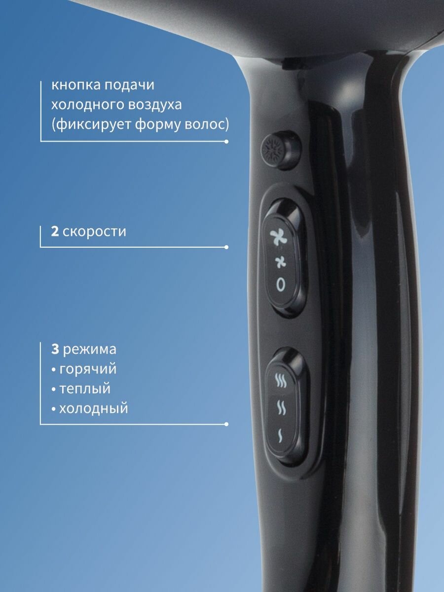 Ионизация Температурные и скоростные режимы комфортные. Нет такого, что горячий воздух слишком горячий, а теплый слишком холодный. Длинный шнур, 3м. |