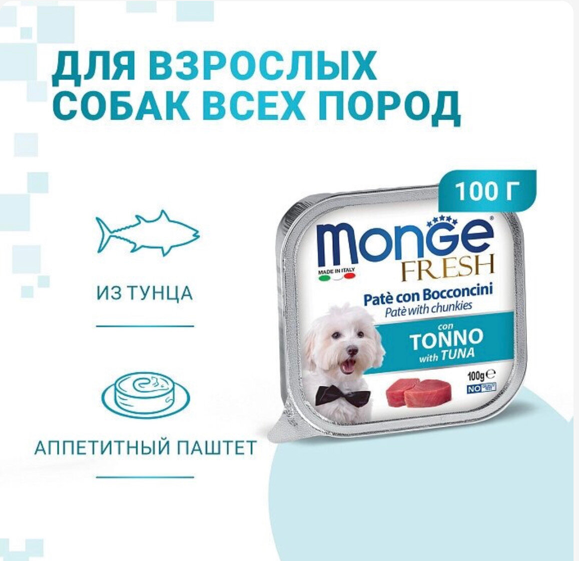 Влажный корм для собак Monge Fresh PATE e BOCCONCINI con TONNO, тунец, 100 г