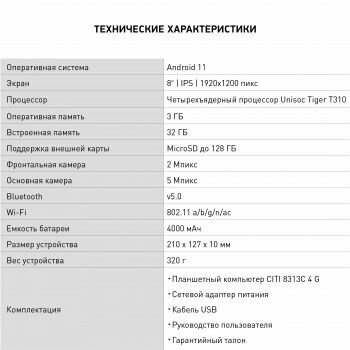 СохранитьПланшет Digma CITI 8313C 4G T310 4C/3Gb/32Gb 8" IPS 1920x1200/3G/4G/And11/белый/BT/GPS/5Mpix/2Mpix/4 интересное: