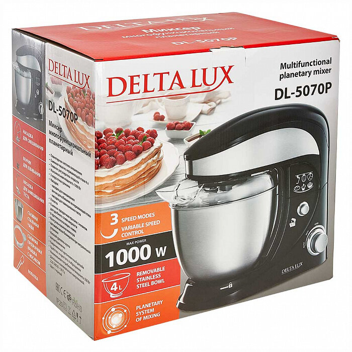 Миксер планетарный DELTA LUX DL-5070Р черный: 1000 Вт,чаша из нерж.стали-4л