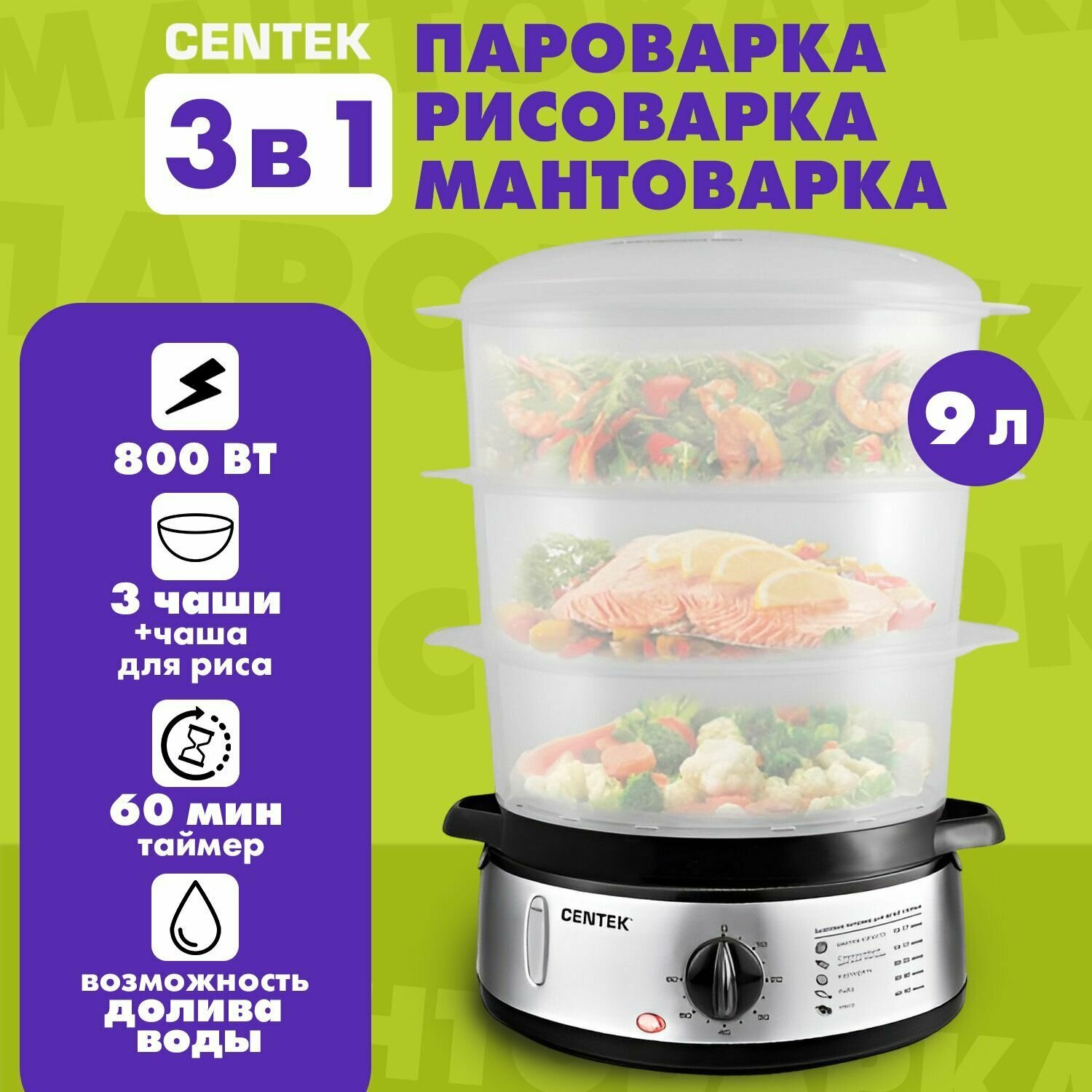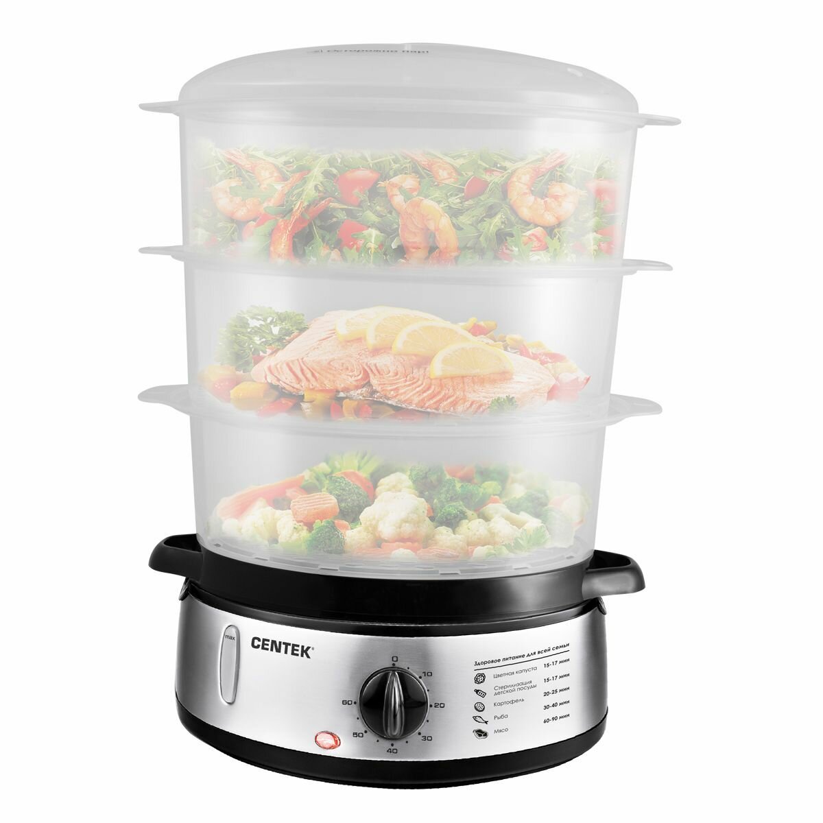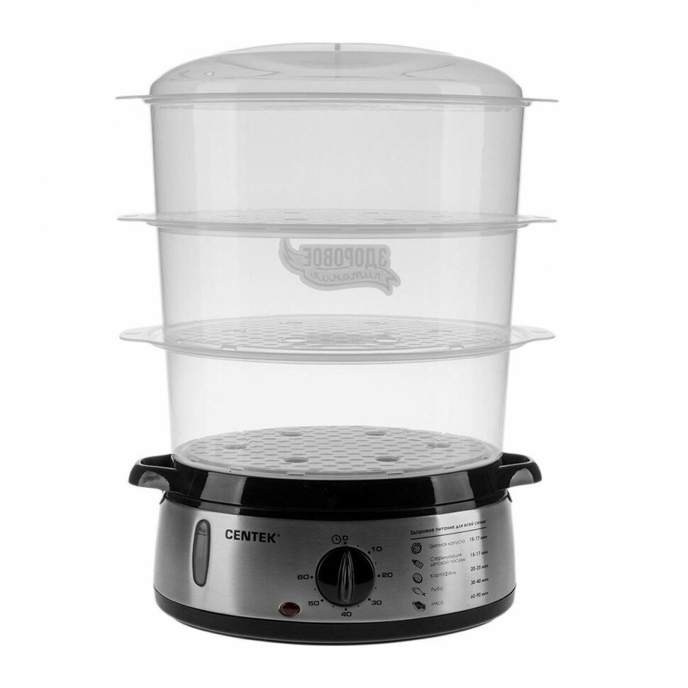 Пароварка Centek CT-1457 <9л> 800Вт, стальной корпус, таймер 60 мин, 3 контейнера