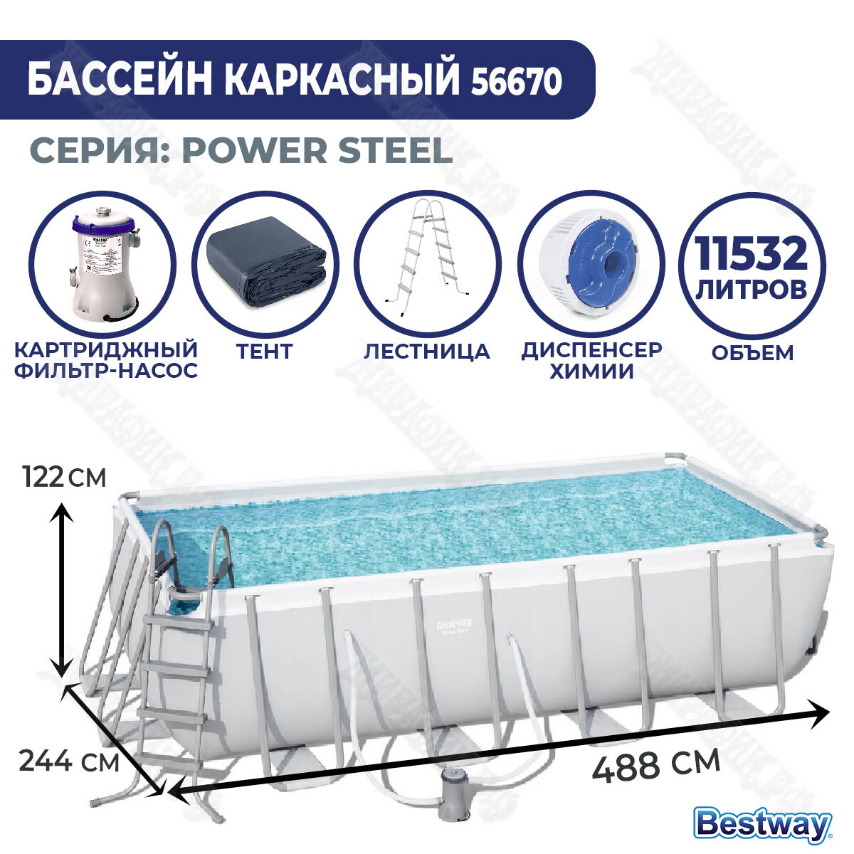 56670 Каркасный бассейн Power Steel 488х244х122см, 11532л, фил.-насос 3028л/ч, лестница, тент, попл.-доз.