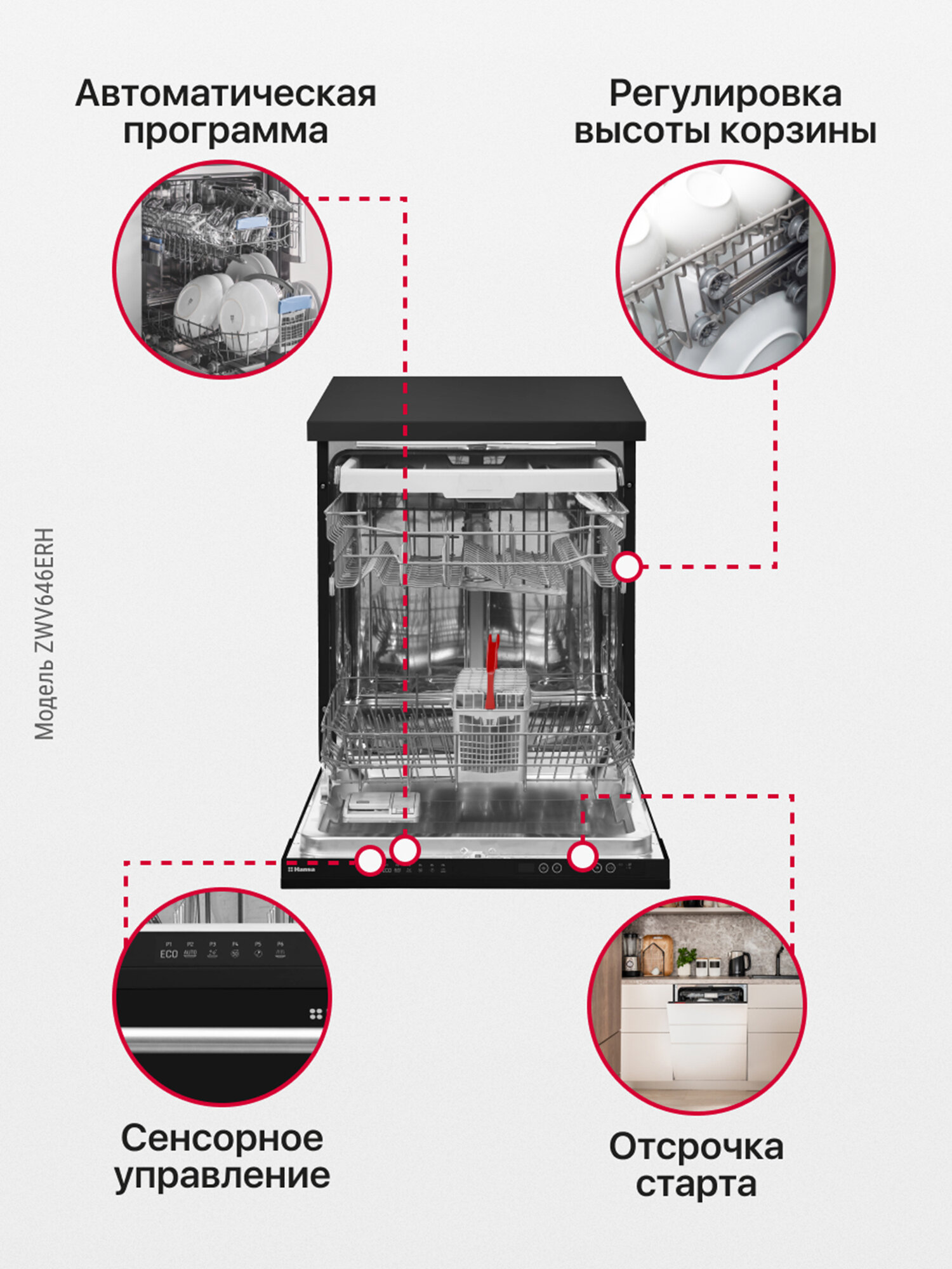 Купить Посудомоечная машина Hansa ZWV646ERH, 60 см, с защитой от протечек, 6 программ, с 3 корзинами, отсрочка старта и половинная загрузка, отдельностоящая