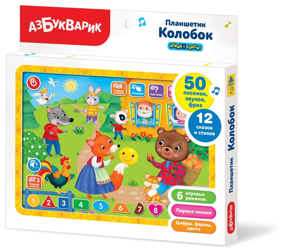 Азбукварик Планшетик "Колобок" (12 говорящих персонажей, 5 сказок, 7 стихотворений, 25 веселых звуков и голосов, 17 песенок, игра, первые знания)