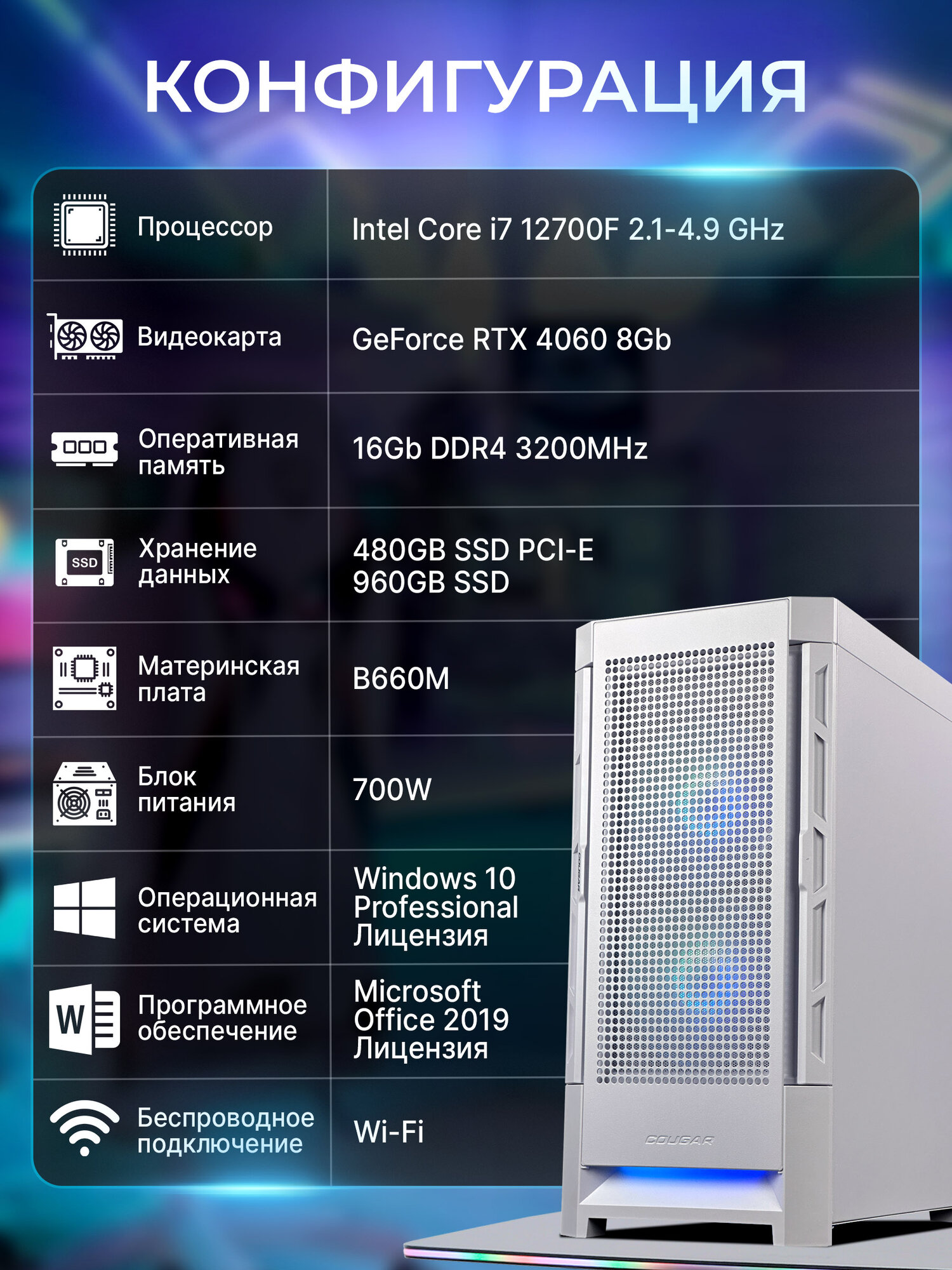Мощный игровой компьютер Борей V3 White / Intel i7 12700F / 16GB / 1TB HDD / 512GB M.2 / RTX 3060 12GB / B660M / 700W / WIN10PRO / MsOffice / WiFi