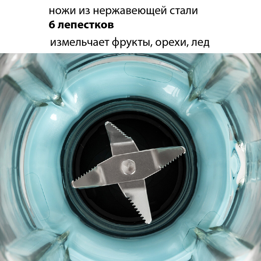 Стационарный блендер Pioneer SB143 mint, импульсный режим, 2 скорости, стеклянный кувшин 1,5 литра, 6-лепестковый нож из нержавеющей стали, 600 Вт