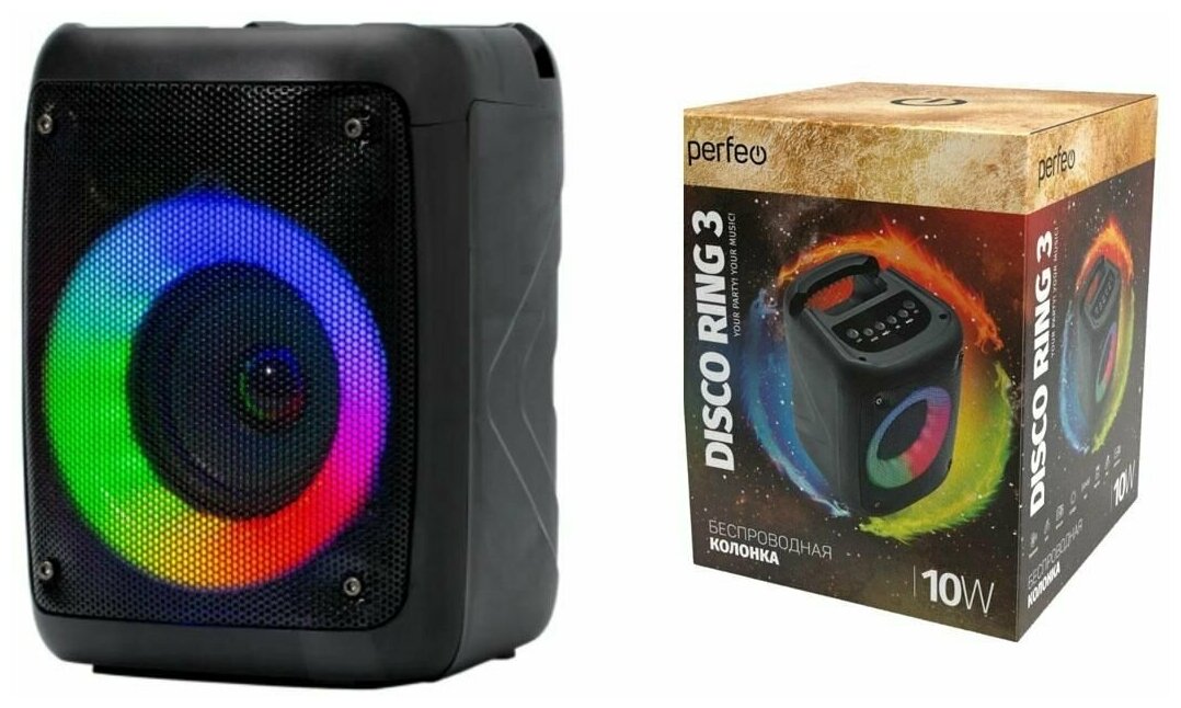 Колонка портативная Perfeo Bluetooth "DISCO RING" 3" LED, FM, MP3, USB/microSD, AUX, TWS, MIC, 10Вт, черная