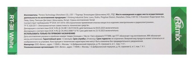 СохранитьТелефон RITMIX RT-311 White, световая индикация звонка, тональный/импульсный режим, повтор, белый интересное: