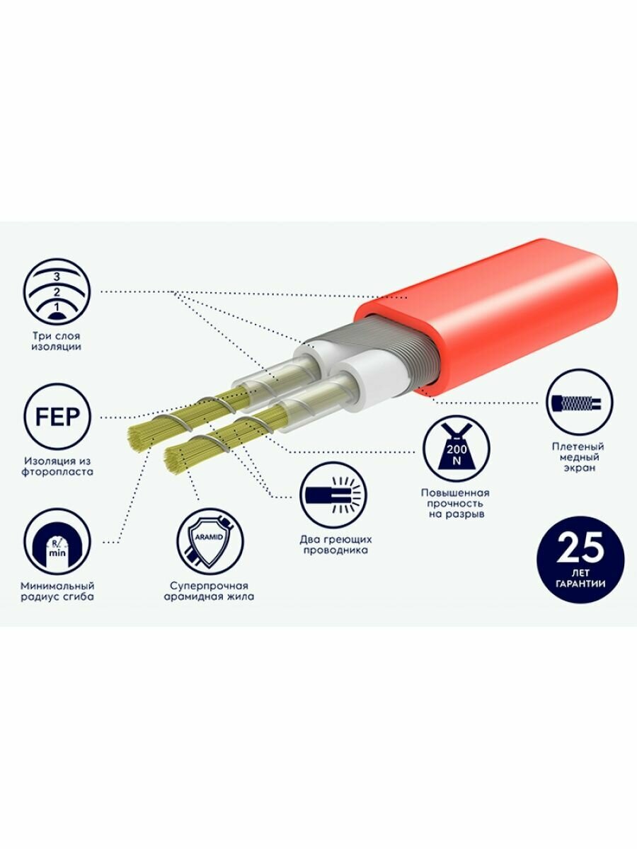 | Дополнительная информация | три слоя изоляции; повышенная прочность на разрыв; два греющих проводника; степень защиты IPX7; толщина мата 3.5 мм; шаг укладки кабеля 7.4 см; сопротивление 645.3 Ом |