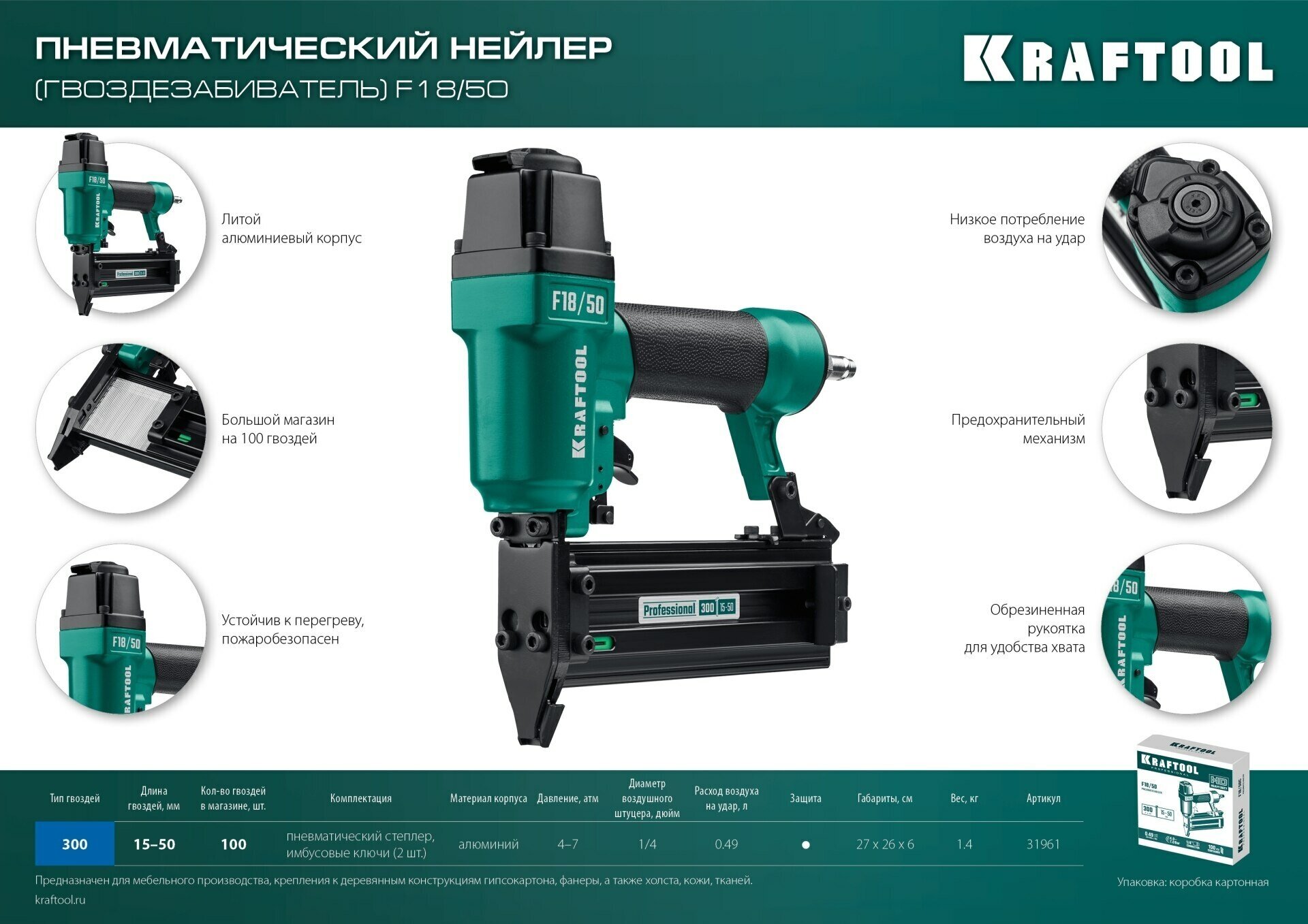 KRAFTOOL F18/50, гвозди тип 300 (15-50 мм), Пневматический нейлер (гвоздезабиватель) (31961)