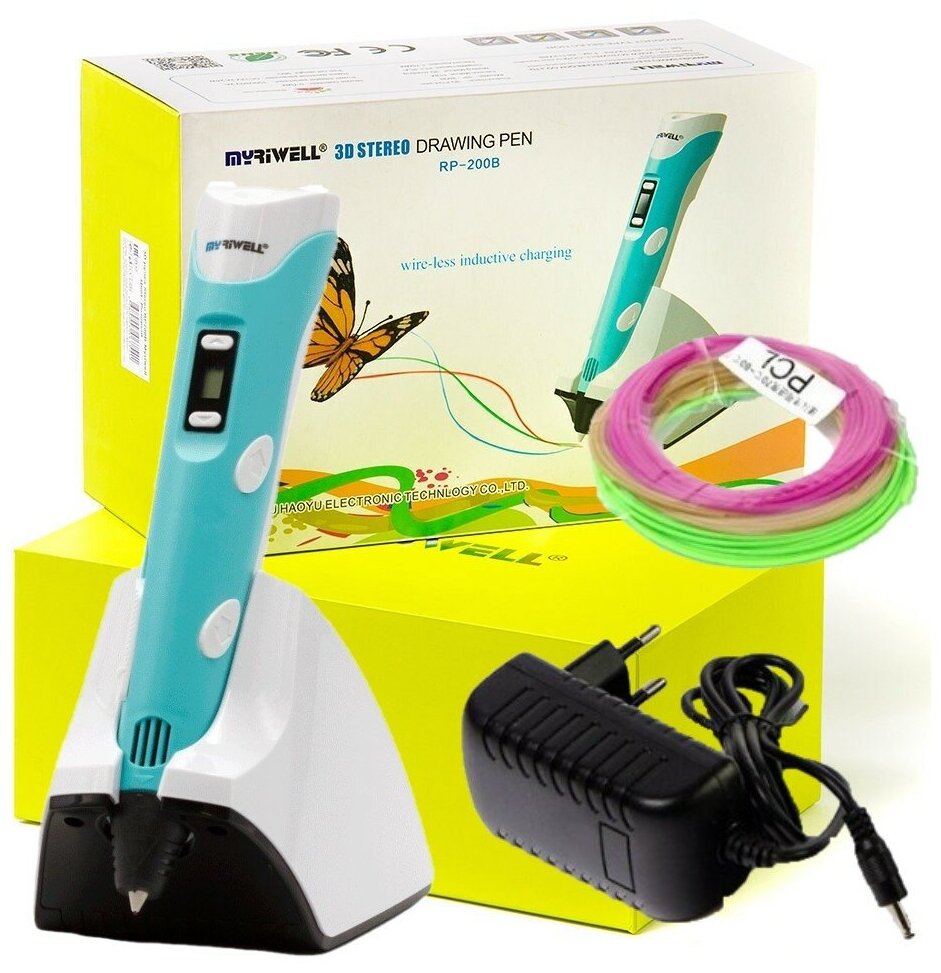 3D Ручка Myriwell RP 200B с аккумулятором с комплектом пластика PLA 100 м/Книжка трафаретов/Прозрачный коврик/Цвет голубой. интересное: