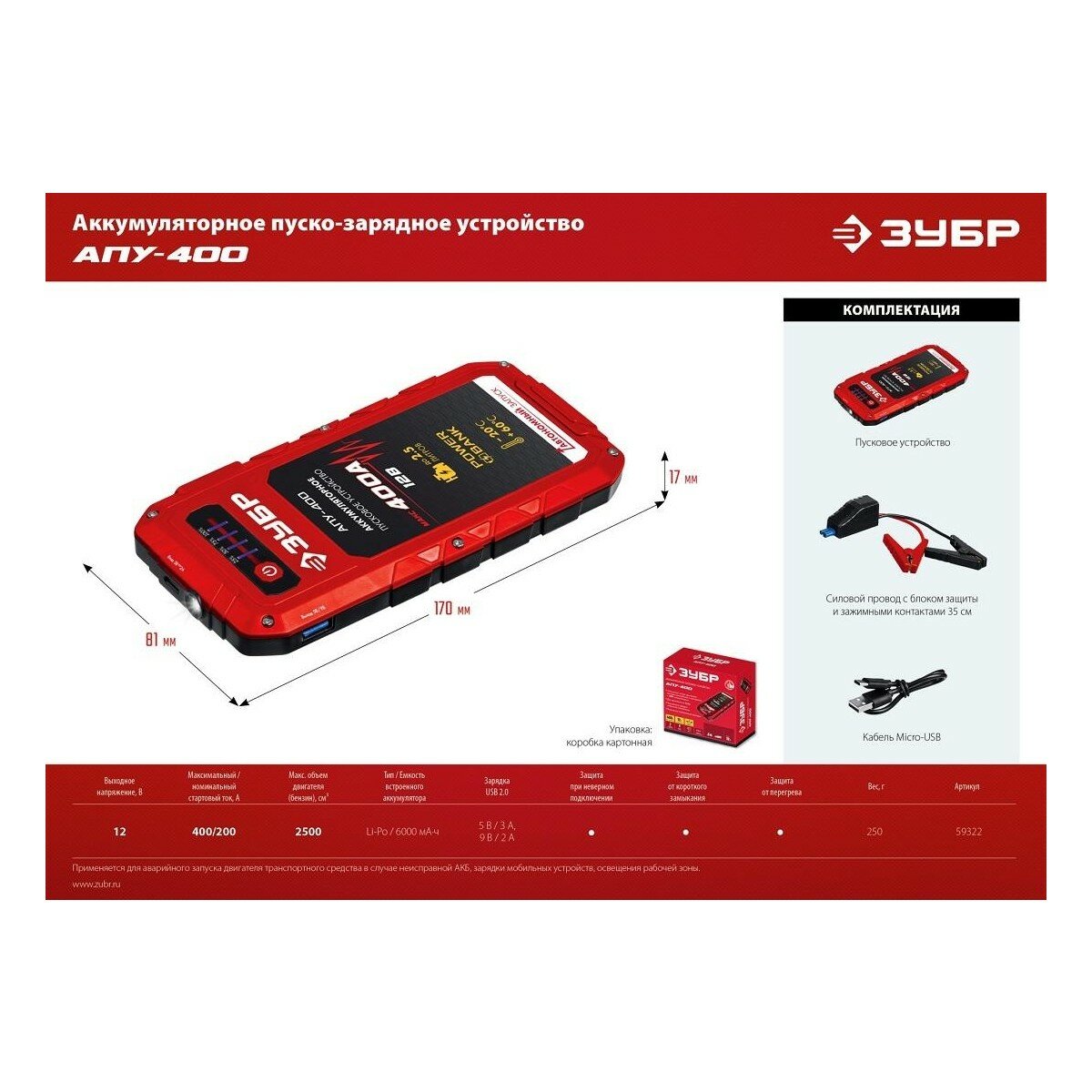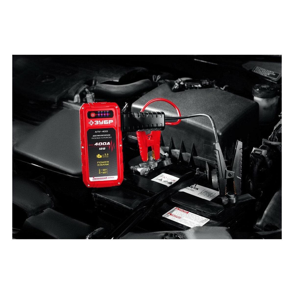 ЗУБР АПУ-400 аккумуляторное пусковое устройство: 12В, макс. 400А.