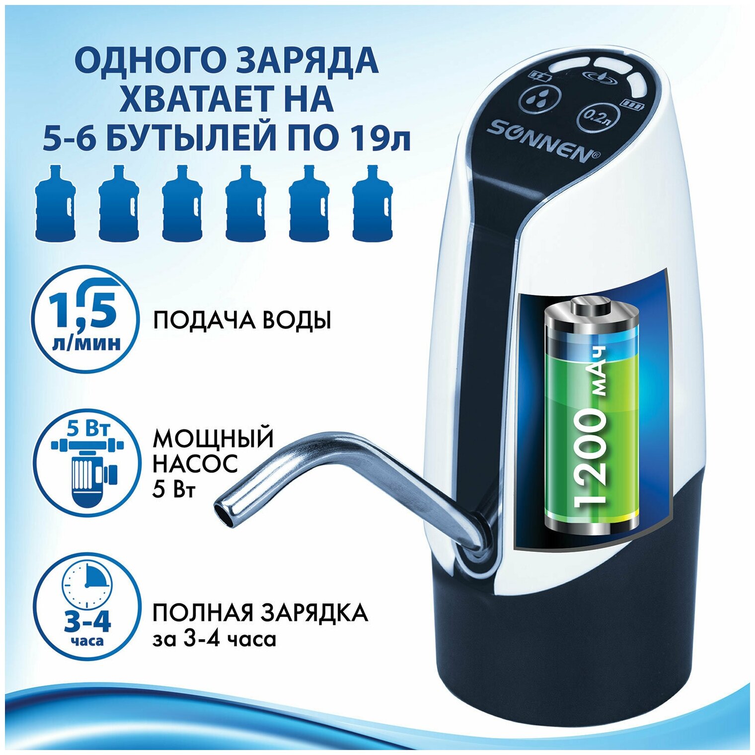 Помпа для воды бутилированной автоматическая / электрическая с подсветкой Sonnen EWD161WG, 1,6 л/мин, Аккумулятор, 455471