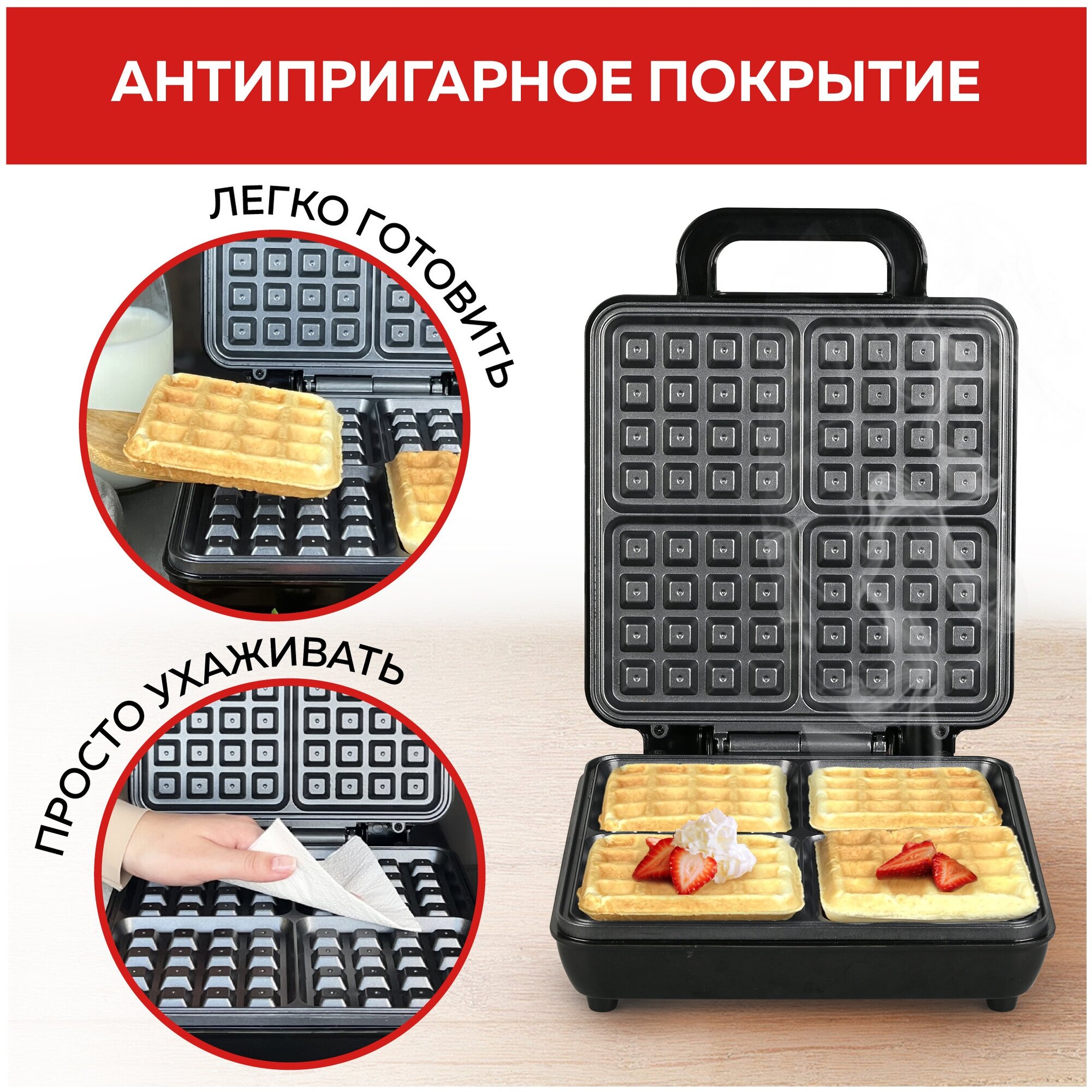GFGRIL Вафельница на 4 вафли GFW-036 для венских и бельгийских вафлей; антипригарное покрытие; 1100 Вт; индикатор включения и нагрева