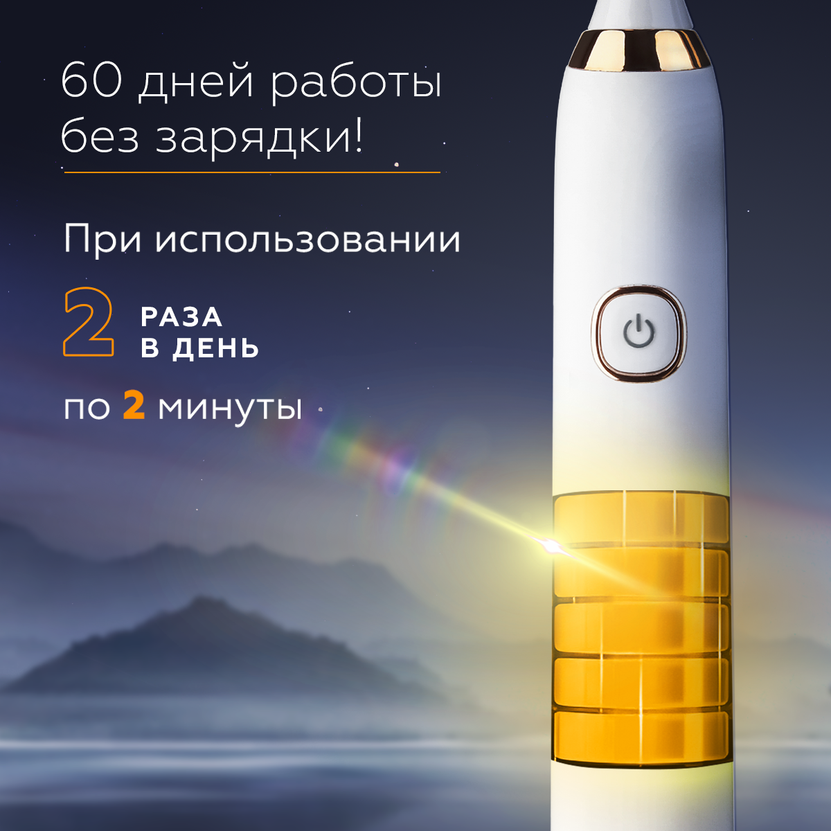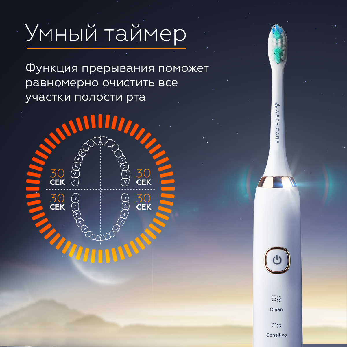 Купить Электрическая зубная щетка AsiaCare S100, 5 режимов работы, 2 насадки, с таймером 4*30 сек, влагозащита IPX7, 30 дней на 1й зарядке. Белая
