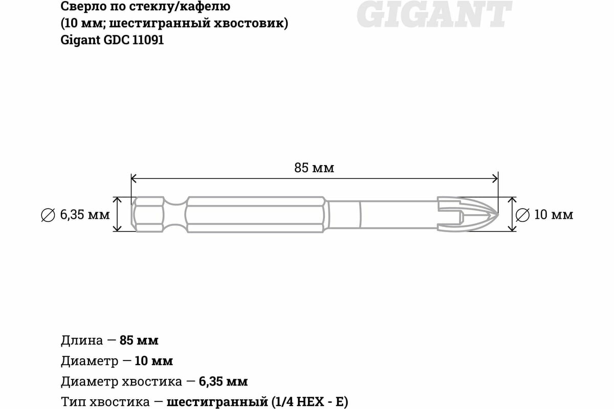 Сверло по стеклу/кафелю (10 мм; шестигранный хвостовик) Gigant GDC 11091