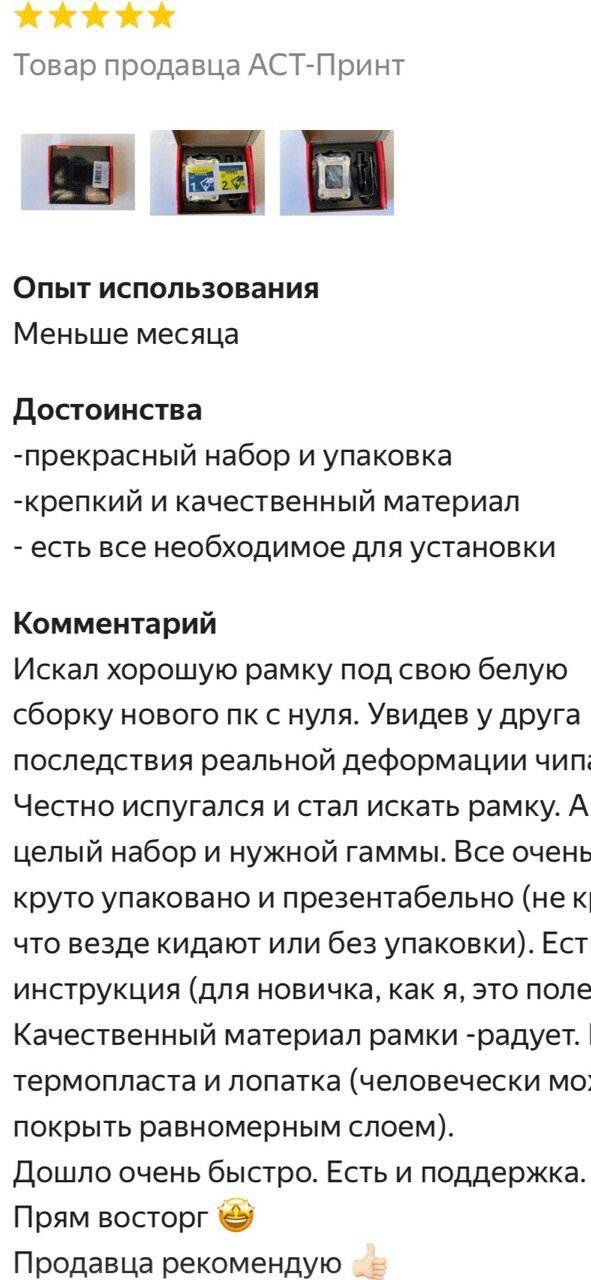 | Отзыв: | Искал хорошую рамку под свою белую сборку нового пк с нуля. Увидев у друга последствия реальной деформации чипа. Честно испугался и стал искать рамку. А тут целый набор и нужной гаммы. Все очень круто упаковано и презентабельно (не крафт, что везде кидают или без упаковки). Есть инструкция (для новичка, как я, это полезно). Качественный материал рамки -радует. Есть термопласта и лопатка (человечески можно покрыть равномерным слоем).