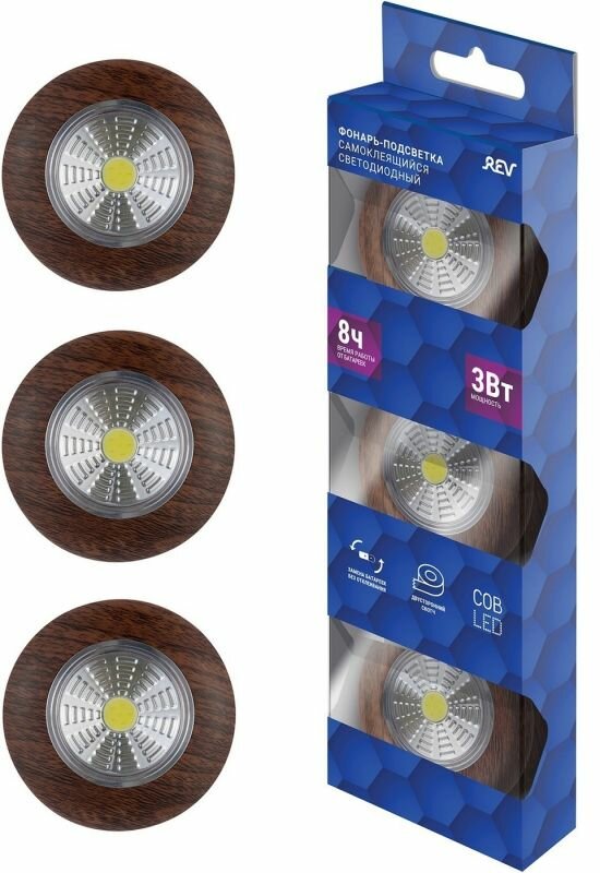 Светодиодный самоклеящийся фонарь-подсветка Rev Pushlight 3Pack дерево, COB 3 Вт, бат. 3xAAA